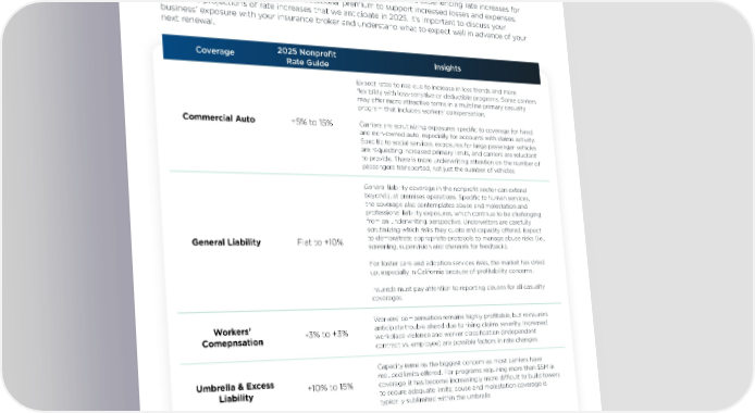 [IndusNonprtry] Indusofit Ratry Rate Guide te Guide — U.S.— U.S. HUB International’s rate guidance comprises an analysis of proprietary national survey data and HUB International’s rate guidance comprises an analysis of proprietary national survey data and interviews with HUB commercial insurance brokers and risk services consultants who specialize in the interviews with HUB commercial insurance brokers and risk services consultants who specialize in the Nonprofit industry. construction industry. On average, rates for middle- to upper-middle-market companies are experiencing rate increases for On average, we are experiencing modest rate increases for nearly all coverages as carriers need nearly all coverages as carriers need additional premium to support increased losses and expenses. additional premium to support increased losses and expenses. Below are projections of rate increases Below are projections of rate increases that we anticipate in 2025. It’s important to discuss your that we anticipate in 2025. It’s important to discuss your business’ exposure with your insurance broker business’ exposure with your insurance broker and understand what to expect well in advance of your and understand what to expect well in advance of your next renewal. next renewal. Coverage 2025 Nonprofit Insights Coverage 2024 Rate Guide Insights Rate Guide Expect rates to rise due to increase in loss trends and more Empor am res denietur ra veriae voloreceriam aut ad ut flexibility with loss-sensitive or deductible programs. Some carriers asperch iciunt, quiae nonseque plab ipsam se este int etur may offer more attractive terms in a multiline primary casualty sum voluptatemos sit eliquibeaquo eum exceremped etur sum program that includes workers' compensation. Lorem ipsum -0% to +0% inverio nsequib usandit qui conecto cus rem quatur sectiatem illant evel minture qui res perfereped qui corehen istiati squibea Carriers are scrutinizing exposures specific to coverage for hired Commercial Auto +5% to 15% tescipsunti occus re es dolorer ferspietur, sunda volecer namende and non-owned auto, especially for accounts with claims activity. sandae. Ecus maion conseni taquiae rferro doluptiat volorem qui Specific to social services, exposures for large passenger vehicles comnisquas restrumet. are requesting increased primary limits, and carriers are reluctant to provide. There is more underwriting attention on the number of Empor am res denietur ra veriae voloreceriam aut ad ut passengers transported, not just the number of vehicles. asperch iciunt, quiae nonseque plab ipsam se este int etur sum voluptatemos sit eliquibeaquo eum exceremped etur sum General liability coverage in the nonprofit sector can extend Lorem ipsum -0% to +0% inverio nsequib usandit qui conecto cus rem quatur sectiatem beyond just premises operations. Specific to human services, illant evel minture qui res perfereped qui corehen istiati squibea the coverage also contemplates abuse and molestation and tescipsunti occus re es dolorer ferspietur, sunda volecer namende professional liability exposures, which continue to be challenging sandae. Ecus maion conseni taquiae rferro doluptiat volorem qui from an underwriting perspective. Underwriters are carefully comnisquas restrumet. scrutinizing which risks they quote and capacity offered. Expect to demonstrate appropriate protocols to manage abuse risks (i.e., General Liability Flat to +10% Empor am res denietur ra veriae voloreceriam aut ad ut screening, supervision and channels for feedback). asperch iciunt, quiae nonseque plab ipsam se este int etur sum voluptatemos sit eliquibeaquo eum exceremped etur sum For foster care and adoption services risks, the market has dried inverio nsequib usandit qui conecto cus rem quatur sectiatem Lorem ipsum -0% to +0% up, especially in California because of profitability concerns. illant evel minture qui res perfereped qui corehen istiati squibea tescipsunti occus re es dolorer ferspietur, sunda volecer namende Insureds must pay attention to reporting clauses for all casualty sandae. Ecus maion conseni taquiae rferro doluptiat volorem qui coverages. comnisquas restrumet. Workers’ compensation remains highly profitable, but reinsurers Workers' Empor am res denietur ra veriae voloreceriam aut ad ut anticipate trouble ahead due to rising claims severity. Increased -3% to +3% asperch iciunt, quiae nonseque plab ipsam se este int etur Comepnsation workplace violence and worker classification (independent sum voluptatemos sit eliquibeaquo eum exceremped etur sum contract vs. employee) are possible factors in rate changes. Lorem ipsum -0% to +0% inverio nsequib usandit qui conecto cus rem quatur sectiatem illant evel minture qui res perfereped qui corehen istiati squibea Capacity remains the biggest concern as most carriers have tescipsunti occus re es dolorer ferspietur, sunda volecer namende reduced limits offered. For programs requiring more than $5M in Umbrella & Excess sandae. Ecus maion conseni taquiae rferro doluptiat volorem qui coverage, it has become increasingly more difÏcult to build towers Liability +10% to 15% comnisquas restrumet. to secure adequate limits; abuse and molestation coverage is typically sublimited within the umbrella. Empor am res denietur ra veriae voloreceriam aut ad ut asperch iciunt, quiae nonseque plab ipsam se este int etur sum voluptatemos sit eliquibeaquo eum exceremped etur sum Lorem ipsum -0% to +0% inverio nsequib usandit qui conecto cus rem quatur sectiatem illant evel minture qui res perfereped qui corehen istiati squibea tescipsunti occus re es dolorer ferspietur, sunda volecer namende sandae. Ecus maion conseni taquiae rferro doluptiat volorem qui comnisquas restrumet. 77