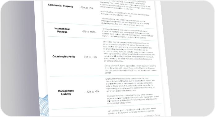 Nonprofit Rate Guide — U.S. 2025 Nonprofit Coverage 2024 Rate Guide Insights Coverage Rate Guide Insights Empor am res denietur ra veriae voloreceriam aut ad ut Results reflect market recovery and depend heavily on account asperch iciunt, quiae nonseque plab ipsam se este int etur metrics (occupancy, business class, loss control, catastrophic sum voluptatemos sit eliquibeaquo eum exceremped etur sum exposure, claims history, etc.). Accounts that are being non- Lorem ipsum -0% to +0% inverio nsequib usandit qui conecto cus rem quatur sectiatem renewed by incumbents, particularly single-carrier placements, are illant evel minture qui res perfereped qui corehen istiati squibea still seeing less favorable results in the form of larger rate increases tescipsunti occus re es dolorer ferspietur, sunda volecer namende and/or increased deductibles or retentions. Commercial Property -10% to +5% sandae. Ecus maion conseni taquiae rferro doluptiat volorem qui comnisquas restrumet. As construction costs continue to rise, insureds should continue reviewing property valuations each year. Empor am res denietur ra veriae voloreceriam aut ad ut asperch iciunt, quiae nonseque plab ipsam se este int etur In addition to rate, deductibles for water damage are also sum voluptatemos sit eliquibeaquo eum exceremped etur sum increasing. Some policies are excluding coverage or increasing inverio nsequib usandit qui conecto cus rem quatur sectiatem Lorem ipsum -0% to +0% deductibles resulting from backup of sewer and drains. illant evel minture qui res perfereped qui corehen istiati squibea tescipsunti occus re es dolorer ferspietur, sunda volecer namende For risks with international exposure, underwriting is based International sandae. Ecus maion conseni taquiae rferro doluptiat volorem qui on account merit and prior loss exposure for foreign package, -5% to +10% comnisquas restrumet. Package business travel accident, and kidnap and ransom. Expect territorial limits for international exposure to high-hazard locations. Empor am res denietur ra veriae voloreceriam aut ad ut asperch iciunt, quiae nonseque plab ipsam se este int etur While rates in certain geographies have stabilized, there are sum voluptatemos sit eliquibeaquo eum exceremped etur sum exceptions — especially for wind- and earthquake-exposed Lorem ipsum -0% to +0% inverio nsequib usandit qui conecto cus rem quatur sectiatem accounts that have seen drastic run-ups in rates and premiums illant evel minture qui res perfereped qui corehen istiati squibea during the hard market cycle. Carriers remain focused on tescipsunti occus re es dolorer ferspietur, sunda volecer namende valuations, driving increased costs for some insurance programs. sandae. Ecus maion conseni taquiae rferro doluptiat volorem qui While signs point to a softening market with specialty carriers, the comnisquas restrumet. Catastrophic Perils Flat to +5% standard is still working to achieve adequate rates on their book. More commonly are dollar (flat) deductibles transitioning to a percentage of coverage. NOTE: Rate is typically defined as the amount of money necessary to cover losses, expenses, and provide an insurance company with a profit for a unit of exposure. Exposure refers to a business’ or individual’s susceptibility to various risks Severe convective storms and wildfires remain significant concerns encountered daily. Carriers evaluate the level of risk an insured faces in calculating insurance premiums. for underwriters, with a major focus on the Atlantic wind season that concludes in November. Flood limits are now typically capped at $5M. Employment Practices Liability claims remain the most frequent source of litigation against organizational leaders, with discrimination, sexual harassment and wrongful termination actions driving losses. Fiduciary liability cases are on the rise Management with new regulatory changes that place additional scrutiny on Liability -10% to +5% retirement and benefit plan sponsors. Employee dishonesty claims lead the way within the crime segment, with computer fraud, funds transfer fraud and fraudulent impersonation (phishing) claims following close behind as state- of-the-art technology evolves. While renewal premiums continue to fall, underwriters remain selective in the nonprofit sector and require more controls. Cyber -10% to Flat Breaches and outages of significant service providers (i.e., Change Healthcare and Crowdstrike) haven’t led to rate hikes yet but may point to harder market conditions in the first half of 2025. 8