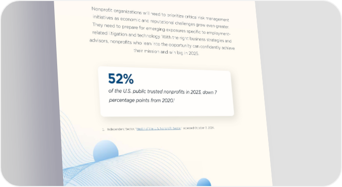 What to Expect in 2025 What to Expect in 2025 Adic to consed qui volorio voluptatus est, int, id mo iuntusa ndent. Nonprofit organizations will need to prioritize critical risk management Et quis aut dolor aut apicidemquis eum solenti con pores sumquas initiatives as economic and reputational challenges grow even greater. pedionsequia doleste veliquae et aliquis de sit laut quia dolorunt, They need to prepare for emerging exposures specific to employment- conemol orruptatem et, occuptamus repelignam, omnis de in cust related litigation and technology. With the right business strategies and vellam volupitia non corerro bla ditest que elicilisto quis maxim advisors, nonprofits who lean into the opportunity can confidently achieve nonecto eossitiures nobit, simet ullab incium, ulla volest ofÏctur? their mission and win big in 2025. Profitability 1 vellam volupitia non corerro bla ditest que vellam volupitia non corerro bla ditest que bla ditest que vellam bla ditest que vellam 52% of the U.S. public trusted nonprofits in 2023, down 7 Vitality 1 percentage points from 2020. 2 vellam volupitia non corerro bla ditest que vellam volupitia non corerro bla ditest que bla ditest que vellam bla ditest que vellam Resiliency 1. Independent Sector, “Health of the U.S. Nonprofit Sector,” accessed October 3, 2024. 3 vellam volupitia non corerro bla ditest que vellam volupitia non corerro bla ditest que bla ditest que vellam bla ditest que vellam Sustainability 4 vellam volupitia non corerro bla ditest que vellam volupitia non corerro bla ditest que bla ditest que vellam bla ditest que vellam 22