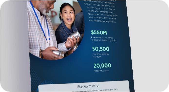 HUB Nonprofit When you partner with us, you’re at the center of a vast network of experts who will help you reach your goals. For more information on how to manage your insurance costs, reduce your risk and take care of your employees, talk to a HUB nonprofit insurance specialist. $550M in commercial insurance premium brokered by HUB 50,500 insurance policies managed 20,000 nonprofit clients Stay up to date Subscribe to receive risk and insurance insights and event invitations throughout 2025. Subscribe hubinternational.com