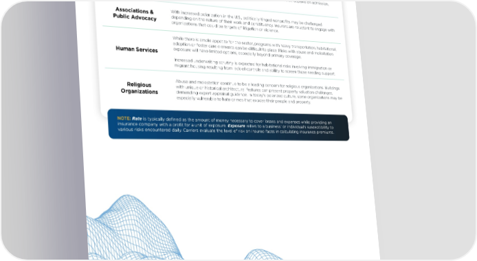 Nonprofit Businesses — U.S. CBusinesoverages 2024 Rate Guide Insights Insights Empor am res denietur ra veriae voloreceriam aut ad ut Arts & Culture has emerged as a target class for many carriers. As public liability challenges asperch iciunt, quiae nonseque plab ipsam se este int etur Arts & Culture persist, operational resilience should be a key concern for clients that depend on admission, sum voluptatemos sit eliquibeaquo eum exceremped etur sum rental and concession revenues. Lorem ipsum -0% to +0% inverio nsequib usandit qui conecto cus rem quatur sectiatem illant evel minture qui res perfereped qui corehen istiati squibea tescipsunti occus re es dolorer ferspietur, sunda volecer namende With increased polarization in the U.S., politically tinged nonprofits may be challenged Associations & sandae. Ecus maion conseni taquiae rferro doluptiat volorem qui depending on the nature of their work and constituency. Insurers are reluctant to engage with Public Advocacy comnisquas restrumet. organizations that could be targets of litigation or violence. Empor am res denietur ra veriae voloreceriam aut ad ut asperch iciunt, quiae nonseque plab ipsam se este int etur While there is ample appetite for the sector, programs with heavy transportation, habitational, sum voluptatemos sit eliquibeaquo eum exceremped etur sum adoption or foster care elements can be difÏcult to place. Risks with abuse and molestation inverio nsequib usandit qui conecto cus rem quatur sectiatem Lorem ipsum exposure will have limited options, especially beyond primary coverage. Human Services -0% to +0% illant evel minture qui res perfereped qui corehen istiati squibea tescipsunti occus re es dolorer ferspietur, sunda volecer namende Increased underwriting scrutiny is expected for habitational risks involving immigration or sandae. Ecus maion conseni taquiae rferro doluptiat volorem qui migrant housing resulting from lack of controls and ability to screen those needing support. comnisquas restrumet. Abuse and molestation continue to be a leading concern for religious organizations. Buildings Religious Empor am res denietur ra veriae voloreceriam aut ad ut with unique or historical architectural features can present property valuation challenges, asperch iciunt, quiae nonseque plab ipsam se este int etur demanding expert appraisal guidance. In today's polarized culture, some organizations may be Organizations sum voluptatemos sit eliquibeaquo eum exceremped etur sum especially vulnerable to hate crimes that expose their people and property. Lorem ipsum -0% to +0% inverio nsequib usandit qui conecto cus rem quatur sectiatem illant evel minture qui res perfereped qui corehen istiati squibea tescipsunti occus re es dolorer ferspietur, sunda volecer namende sandae. Ecus maion conseni taquiae rferro doluptiat volorem qui NOTE: Rate is typically defined as the amount of money necessary to cover losses and expenses while providing an comnisquas restrumet. insurance company with a profit for a unit of exposure. Exposure refers to a business’ or individual’s susceptibility to various risks encountered daily. Carriers evaluate the level of risk an insured faces in calculating insurance premiums. 9