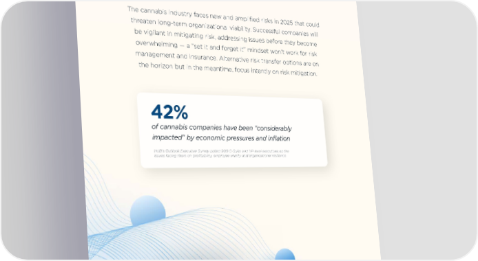 What to Expect in 2025 What to Expect in 2025 The cannabis industry faces new and amplified risks in 2025 that could threaten long-term organizational viability. Successful companies will be vigilant in mitigating risk, addressing issues before they become overwhelming — a “set it and forget it” mindset won’t work for risk management and insurance. Alternative risk transfer options are on the horizon but in the meantime, focus intently on risk mitigation. 42% of cannabis companies have been “considerably impacted” by economic pressures and inflation HUB’s Outlook Executive Survey polled 900 C-Suite and VP-level executives on the issues facing them on profitability, employee vitality and organizational resilience. 2