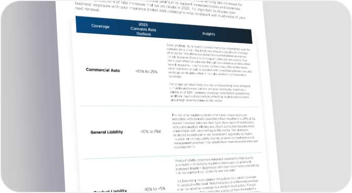Cannabis Rate Guide — U.S. HUB International’s rate guidance comprises an analysis of proprietary national survey data and interviews with HUB commercial insurance brokers and risk services consultants who specialize in the cannabis industry. On average, rates for middle- to upper-middle-market companies are experiencing rate increases for nearly all coverages as carriers need additional premium to support increased losses and expenses. Below are projections of rate increases that we anticipate in 2025. It’s important to discuss your business’ exposure with your insurance broker and understand what to expect well in advance of your next renewal. 2025 Coverage Cannabis Rate Insights Outlook Given profitability concerns, carriers that once entertained auto for cannabis risks are pulling back, resulting in a significant shortage of capacity. Rate increases persist to counterbalance rising loss trends; however, there are still opportunities for insureds to find more cost-effective solutions through loss-sensitive or deductible- based programs. In some cases, carriers may offer better terms when commercial auto is bundled with a multiline primary casualty Commercial Auto +10% to 25% package, particularly when it includes workers' compensation coverage. For larger cannabis fleets, insurers are becoming more stringent. Umbrella and excess carriers are now commonly requiring a minimum of $2M in primary coverage limits before considering additional layers of protection, reflecting heightened concerns about high severity claims in this sector. The evolving regulatory environment and unique exposures associated with cannabis operations have resulted in a difÏcult GL market. However, rates are starting to show signs of stabilization, with some markets offering reductions as insurers become more General Liability -10% to Flat comfortable with underwriting in this sector. The strategies deployed by each carrier are inconsistent, especially by region. Insureds with strong safety records or more comprehensive risk management practices may benefit from more favorable rates and coverage terms. Product liability rates have remained consistently high due to a complex and evolving regulatory landscape, coupled with increased litigation. Businesses with clean loss history and strong risk management could start to see rate relief. It is becoming more common for policies to sublimit coverage Product Liability -10% to +5% for product withdrawal. Note that product withdrawal coverage is not as broad as coverage in a product recall policy. Though the cost of voluntarily removing a product from the market is typically covered. under product withdrawal, additional liabilities like third-party damages or regulatory fines are not covered. With heightened scrutiny from governmental agencies, the industry expects an uptick in claims. Make sure you understand your exposure and coverage – and discuss thoroughly with your broker. 8