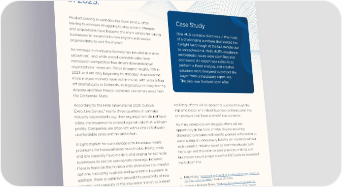 Profitability As margins shrink, insurance can help protect profits in 2025. Product pricing in cannabis has been erratic, often Case Study leaving businesses struggling to stay solvent. Mergers One HUB cannabis client was in the midst and acquisitions have become the main vehicle for strong of a challenging purchase that looked like businesses to expand into new regions and weaker it might fall through at the last minute due organizations to exit the market. to unresolved risk. With HUB’s assistance, An increase in marijuana licenses has resulted in market problematic issues were identified and 1 and while overall cannabis sales have saturation, addressed. An expert was called in to 2 increased, competition has driven down individual perform a flood analysis, and creative organizations’ revenues: Prices dropped roughly 10% in solutions were designed to protect the 3 2023 and are only beginning to stabilize. And even the buyer from unnecessary exposures. more mature markets were not immune, with sales falling The deal was finalized soon after. off dramatically in Colorado, as legalization in neighboring Arizona and New Mexico siphoned customers away from the Centennial State. According to the HUB International 2025 Outlook resiliency efforts will be poised for success through the 4 implementation of a robust business continuity plan that Executive Survey, nearly three-quarters of cannabis industry respondents say their organizations do not have can pressure test these potential loss scenarios. adequate insurance to protect against risks that will harm As many operations will struggle, others will see profits. Companies are often left with a choice between opportunity in the form of M&A. Buyers acquiring unaffordable rates and no protection. distressed companies will need to proceed with caution to A tight market for commercial auto insurance means avoid taking on unnecessary liability. An insurance advisor premiums for transportation have tripled. Rising costs with cannabis industry expertise can help educate both and low capacity have made it challenging for cannabis the buyer and the seller on best practices, making sure businesses to secure appropriate coverage. However, businesses secure proper runoff or D&O policies to protect there is hope on the horizon with alternative risk transfer the bottom line. options, including captives and parametric insurance. In addition, there is optimism around the possibility of new 1. MJBiz Daily, “Approved and pending marijuana licenses rise in US entrants and capacity in the insurance market as a result for first time in 2 years,” August 19, 2024. of the SAFE Banking Act. 2. Cannabis Business Times, “Whitney Economics Forecasts US Regulated Cannabis Sales to Top $31.4 Billion in 2024,” March Companies must make improved risk management 20, 2024. a cornerstone of profitability, as many companies 3. PR Newswire, “Leaflink’s 2024 Wholesale Cannabis Pricing Guide Now Available,” April 2, 2024. are one event — a weather disaster, supply chain 4. HUB’s Outlook Executive Survey polled 900 C-Suite and VP-level breakdown or cybercrime — away from bankruptcy. executives on the issues facing them on profitability, employee Cannabis organizations who focus on organizational vitality and organizational resilience. 3