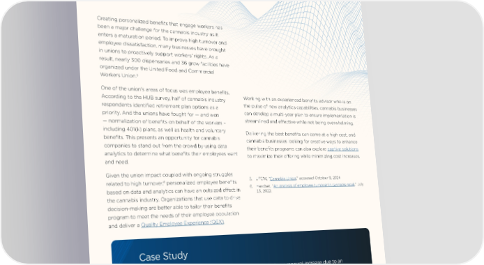 Vitality As the industry matures, benefits will need to keep pace. Creating personalized benefits that engage workers has been a major challenge for the cannabis industry as it enters a maturation period. To improve high turnover and employee dissatisfaction, many businesses have brought in unions to proactively support workers’ rights. As a result, nearly 300 dispensaries and 36 grow facilities have organized under the United Food and Commercial 5 Workers Union. One of the union’s areas of focus was employee benefits. According to the HUB survey, half of cannabis industry Working with an experienced benefits advisor who is on respondents identified retirement plan options as a the pulse of new analytics capabilities, cannabis businesses priority. And the unions have fought for — and won can develop a multi-year plan to ensure implementation is — normalization of benefits on behalf of the workers – streamlined and effective while not being overwhelming. including 401(k) plans, as well as health and voluntary Delivering the best benefits can come at a high cost, and benefits. This presents an opportunity for cannabis cannabis businesses looking for creative ways to enhance companies to stand out from the crowd by using data their benefits programs can also explore captive solutions analytics to determine what benefits their employees want to maximize their offering while minimizing cost increases. and need. Given the union impact coupled with ongoing struggles related to high turnover,6 personalized employee benefits 5. UFCW, “Cannabis Union,” accessed October 9, 2024 based on data and analytics can have an outsized effect in 6. Headset, “An analysis of employee turnover in cannabis retail,” July 13, 2022. the cannabis industry. Organizations that use data to drive decision-making are better able to tailor their benefits program to meet the needs of their employee population and deliver a Quality Employee Experience (QEX). Case Study A cannabis-adjacent real estate business experienced a large renewal increase due to an employee’s child requiring expensive prescription drugs, totaling more than $200,000 in Rx claims alone. By joining HUB’s Cannabis Captive, the client was able to carve out their pharmacy plan to reduce specialty drugs claims to $5,000. 4