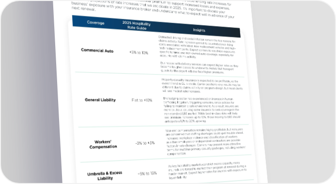 [IndusHospitality Ratry] Industry Rate Guide te Guide — U.S.— U.S. HUB International’s rate guidance comprises an analysis of proprietary national survey data and HUB International’s rate guidance comprises an analysis of proprietary national survey data and interviews with HUB commercial insurance brokers and risk services consultants who specialize in the interviews with HUB commercial insurance brokers and risk services consultants who specialize in the Hospitality industry. construction industry. On average, rates for middle- to upper-middle-market companies are experiencing rate increases for On average, we are experiencing modest rate increases for nearly all coverages as carriers need nearly all coverages as carriers need additional premium to support increased losses and expenses. additional premium to support increased losses and expenses. Below are projections of rate increases Below are projections of rate increases that we anticipate in 2025. It’s important to discuss your that we anticipate in 2025. It’s important to discuss your business’ exposure with your insurance broker business’ exposure with your insurance broker and understand what to expect well in advance of your and understand what to expect well in advance of your next renewal. next renewal. Coverage 2025 Hospitality Insights Coverage 2024 Rate Guide Insights Rate Guide Distracted driving and social inflation remain the top reasons for Empor am res denietur ra veriae voloreceriam aut ad ut claims activity. Rate increases persist to counterbalance rising asperch iciunt, quiae nonseque plab ipsam se este int etur costs associated with labor, new replacement vehicles and high- sum voluptatemos sit eliquibeaquo eum exceremped etur sum tech replacement parts. Expect carriers to scrutinize exposures Lorem ipsum -0% to +0% inverio nsequib usandit qui conecto cus rem quatur sectiatem specific to hired and non-owned auto coverage, especially for Commercial Auto +5% to 10% illant evel minture qui res perfereped qui corehen istiati squibea accounts with claims activity. tescipsunti occus re es dolorer ferspietur, sunda volecer namende sandae. Ecus maion conseni taquiae rferro doluptiat volorem qui Businesses with delivery services can expect higher rates as they comnisquas restrumet. become tougher classes to underwrite. Hotels that transport guests to the airport will also face higher premiums. Empor am res denietur ra veriae voloreceriam aut ad ut asperch iciunt, quiae nonseque plab ipsam se este int etur Property-casualty insurance is expected to be profitable, so the sum voluptatemos sit eliquibeaquo eum exceremped etur sum overall trend in GL is stable. Carrier positions vary; results may be Lorem ipsum -0% to +0% inverio nsequib usandit qui conecto cus rem quatur sectiatem different due to claims activity or program design, but most clients illant evel minture qui res perfereped qui corehen istiati squibea will see modest rate increases. tescipsunti occus re es dolorer ferspietur, sunda volecer namende sandae. Ecus maion conseni taquiae rferro doluptiat volorem qui The lodging sector has experienced an increase in human General Liability Flat to +10% comnisquas restrumet. trafÏcking litigation, triggering some insurance policies for failing to maintain a safe environment. As a result, insurers are Empor am res denietur ra veriae voloreceriam aut ad ut more cautious, causing some insureds to seek coverage in the asperch iciunt, quiae nonseque plab ipsam se este int etur non-standard E&S market. While best-in-class risks will likely sum voluptatemos sit eliquibeaquo eum exceremped etur sum see premium increases up to 10%, those moving to E&S should inverio nsequib usandit qui conecto cus rem quatur sectiatem Lorem ipsum -0% to +0% anticipate a 15% to 20% upswing. illant evel minture qui res perfereped qui corehen istiati squibea tescipsunti occus re es dolorer ferspietur, sunda volecer namende Workers’ compensation remains highly profitable, but reinsurers sandae. Ecus maion conseni taquiae rferro doluptiat volorem qui are concerned that stafÏng shortages could spell trouble ahead. comnisquas restrumet. Workers' Increased workplace violence and classification of workers -3% to +3% as either employees or independent contractors are possible Compensation Empor am res denietur ra veriae voloreceriam aut ad ut factors in rate changes. Carriers may present more attractive asperch iciunt, quiae nonseque plab ipsam se este int etur terms for multiline primary casualty packages, including workers' sum voluptatemos sit eliquibeaquo eum exceremped etur sum compensation. Lorem ipsum -0% to +0% inverio nsequib usandit qui conecto cus rem quatur sectiatem illant evel minture qui res perfereped qui corehen istiati squibea tescipsunti occus re es dolorer ferspietur, sunda volecer namende As key hospitality markets constrict excess capacity, many Umbrella & Excess sandae. Ecus maion conseni taquiae rferro doluptiat volorem qui insureds are forced to market their program at renewal during a +5% to 15% comnisquas restrumet. Liability harder market. Expect higher rates for any risk with exposure to liquor liability. Empor am res denietur ra veriae voloreceriam aut ad ut asperch iciunt, quiae nonseque plab ipsam se este int etur sum voluptatemos sit eliquibeaquo eum exceremped etur sum Insurance packages are more stable because of a bigger premium Package Flat to +10% inverio nsequib usandit qui conecto cus rem quatur sectiatem Lorem ipsum -0% to +0% pot, with one carrier offsetting losses on any one line. illant evel minture qui res perfereped qui corehen istiati squibea tescipsunti occus re es dolorer ferspietur, sunda volecer namende sandae. Ecus maion conseni taquiae rferro doluptiat volorem qui comnisquas restrumet. 88