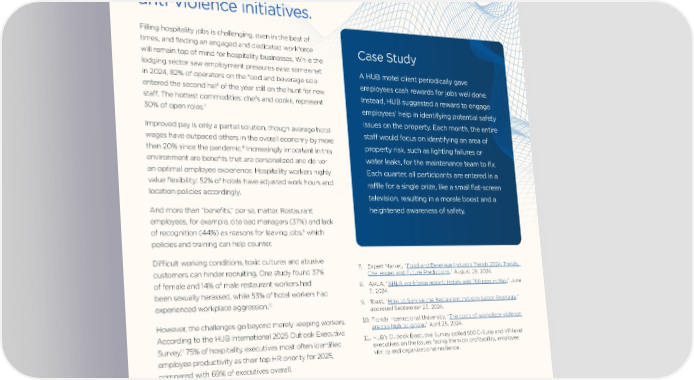 Vitality Fortify your workforce through flexibility, personalized benefits and anti-violence initiatives. Filling hospitality jobs is challenging, even in the best of times, and finding an engaged and dedicated workforce Case Study will remain top of mind for hospitality businesses. While the lodging sector saw employment pressures ease somewhat A HUB motel client periodically gave in 2024, 82% of operators on the food and beverage side employees cash rewards for jobs well done. entered the second half of the year still on the hunt for new Instead, HUB suggested a reward to engage staff. The hottest commodities: chefs and cooks, represent 7 employees’ help in identifying potential safety 30% of open roles. issues on the property. Each month, the entire Improved pay is only a partial solution, though average hotel staff would focus on identifying an area of wages have outpaced others in the overall economy by more property risk, such as lighting failures or 8 than 20% since the pandemic. Increasingly important in this environment are benefits that are personalized and deliver water leaks, for the maintenance team to fix. an optimal employee experience. Hospitality workers highly Each quarter, all participants are entered in a value flexibility: 52% of hotels have adjusted work hours and rafÒe for a single prize, like a small flat-screen location policies accordingly. television, resulting in a morale boost and a And more than “benefits,” per se, matter. Restaurant heightened awareness of safety. employees, for example, cite bad managers (37%) and lack 9 of recognition (44%) as reasons for leaving jobs, which policies and training can help counter. DifÏcult working conditions, toxic cultures and abusive customers can hinder recruiting. One study found 37% 7. Expert Market, “Food and Beverage Industry Trends 2024: Trends, Challenges and Future Predictions,” August 19, 2024. of female and 14% of male restaurant workers had 8. AHLA, “AHLA workforce report: Hotels add 700 jobs in May,” June been sexually harassed, while 53% of hotel workers had 7, 2024. 10 9. Toast, “How to Survive the Restaurant Industry Labor Shortage,” experienced workplace aggression. accessed September 23, 2024. However, the challenges go beyond merely keeping workers. 10. Florida International University, “The costs of workplace violence According to the HUB International 2025 Outlook Executive are too high to ignore,” April 25, 2024. 11 11. HUB’s Outlook Executive Survey polled 900 C-Suite and VP-level Survey, 75% of hospitality executives most often identified executives on the issues facing them on profitability, employee employee productivity as their top HR priority for 2025, vitality and organizational resilience. compared with 69% of executives overall. A focus on training does more than improve job readiness and enable career advancement. It keeps workplace vitality invigorated. This should include manager awareness training and a hard look at hiring practices about workplace violence and how to de-escalate violent situations. Doing so will improve the workplace culture – and recruitment and retention. Additionally, better access to mental health benefits will positively impact overall employee satisfaction. 4