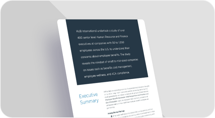 HUB International undertook a study of over 400 senior level Human Resource and Finance executives at companies with 50 to 1,000 employees across the U.S. to understand their concerns about employee benefits. The study reveals the mindset of small to mid-sized companies on issues such as benefits cost management, employee wellness, and ACA compliance. Executive HR leaders are operating in an era of unprecedented disruption brought on by ACA, rising health care costs and the increasing demands of a multi-generational workforce. A research study by HUB International, Summary Employee Benefits Barometer: SMB Perspectives and Priorities in an Era of Disruption, captures decision-maker opinions, concerns and self-assessments on how well their employee benefit strategies are performing. Among the key findings: Ȋ Employee wellness and productivity is a top priority and two thirds of respondents are seeing a return on investment in their programs, specifically in improved employee productivity and morale. Ȋ Respondents are reaping the benefits of their cost-cutting initiatives, but there appears to be many missed opportunities to deploy proven cost management strategies. Ȋ Employers perceive themselves to be on top of ACA reporting issues but nearly two-thirds say that their business will struggle to stay afloat despite efforts to optimize plan designs and operations, an indication that employers are exhausted by ACA compliance. Ȋ Despite a solid working relationship and common ground on major benefits issues, there are some troubling disconnects between HR and Finance leaders that could hinder their ability to achieve organizational goals. Research Report | Employee Benefits Barometer: SMB Perspectives and Priorities in an Era of Disruption 3