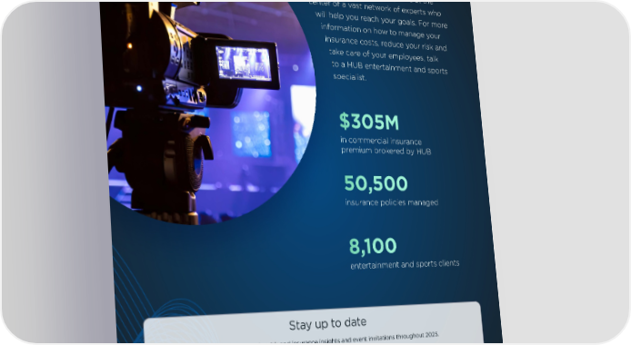 HUB Entertainment & Sports When you partner with us, you’re at the center of a vast network of experts who will help you reach your goals. For more information on how to manage your insurance costs, reduce your risk and take care of your employees, talk to a HUB entertainment and sports specialist. $305M in commercial insurance premium brokered by HUB 50,500 insurance policies managed 8,100 entertainment and sports clients Stay up to date Subscribe to receive risk and insurance insights and event invitations throughout 2025. Subscribe hubinternational.com