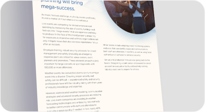 Festivals and Large Events “Mega-events” bring mega-risk, but sophisticated planning will bring mega-success. As music festivals and large, multi-day events proliferate, it’s not a matter of if but when a crisis will occur. Live events are competing for limited entertainment spending by increasing the size of events, turning small festivals into “mega-events” that are expensive and risky to produce. In the face of this trend, properly preparing for exposures is imperative and will help organizations not only mitigate losses but also decrease reputational fallout after an incident. Other trends include adopting crowd monitoring systems and apps that can identify issues and communicate to Employee training, robust security protocols for crowd both staff and attendees in real time, as well as using facial management and safety (including an emergency authentication software to enhance security. response plan) are critical for venue owners, event planners and promoters. These protocols are particularly Venues and production firms are also going back to the important for large concerts or sporting events with basics: Designating a point person empowered to cancel 100,000 or more attendees. an event or evacuate a facility and routinely running tabletop exercises to prepare for all risks. Weather events like convective storms can turn a mega- event into a disaster. Ensuring proper security and safety can be difÏcult — experienced safety and security professionals have left the industry, taking with them years of industry knowledge and expertise. However, sophisticated weather modeling, communication strategies and advanced security processes are reducing risk. Live event companies are investing in weather forecasting technologies and embracing new methods to better communicate with staff and attendees to evacuate a space quickly if needed. In fact, nearly 40% of entertainment and sports respondents to the HUB survey are using modeling and forecasting to evaluate the potential impact of anticipated risks. 66