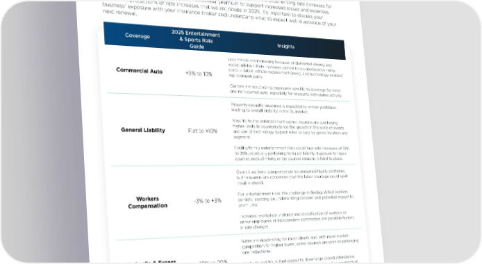 Entertainment & Sports Rate Guide — U.S. HUB International’s rate guidance comprises an analysis of proprietary national survey data and interviews with HUB commercial insurance brokers and risk services consultants who specialize in the Entertainment & Sports industry. On average, rates for middle- to upper-middle-market companies are experiencing rate increases for nearly all coverages as carriers need additional premium to support increased losses and expenses. Below are projections of rate increases that we anticipate in 2025. It’s important to discuss your business’ exposure with your insurance broker and understand what to expect well in advance of your next renewal. 2025 Entertainment Coverage & Sports Rate Insights Guide Loss trends are increasing because of distracted driving and social inflation. Rate increases persist to counterbalance rising costs — labor, vehicle replacement (new), and technology-enabled Commercial Auto +5% to 10% replacement parts. Carriers are scrutinizing exposures specific to coverage for hired and non-owned auto, especially for accounts with claims activity. Property-casualty insurance is expected to remain profitable, leading to overall stability in the GL market. Specific to the entertainment sector, insureds are purchasing higher limits to counterbalance the growth in the scale of events General Liability Flat to +10% and use of technology. Expect rates to vary by genre, location and segment. Facility/family entertainment risks could face rate increases of 15% to 25%, especially pertaining to liquor liability. Exposure to ropes courses, rock climbing or zip courses remains is hard to place. Overall, workers’ compensation has remained highly profitable, but reinsurers are concerned that the labor shortage could spell trouble ahead. Workers For entertainment risks, the challenge in finding skilled workers Compensation -3% to +3% persists, creating an underwriting concern and potential impact to premiums. Increased workplace violence and classification of workers as either employees or independent contractors are possible factors in rate changes. Rates are moderating for most clients and, with more market competition for higher layers, some insureds are even experiencing rate reductions. Umbrella & Excess +10% to 20% Liability Festivals and tours that expect to draw large crowd attendance could be required to purchase higher limits, based on contractual obligations to the specific venue. 8