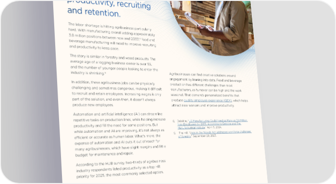 Vitality Data analytics to develop personalized benefits will boost productivity, recruiting and retention. The labor shortage is hitting agribusiness particularly hard. With manufacturing overall adding approximately 8 3.8 million positions between now and 2033, food and beverage manufacturing will need to improve recruiting and productivity to keep pace. The story is similar in forestry and wood products: The average age of a logging business owner is over 55, and the number of younger people looking to enter the 9 Agribusinesses can find creative solutions around industry is shrinking. engagement by leaning into data. Food and beverage In addition, these agribusiness jobs can be physically production has different challenges than most challenging and sometimes dangerous, making it difÏcult manufacturers, as turnover can be high and the work to recruit and retain employees. Increasing wages is only seasonal. That demands personalized benefits that part of the solution, and even then, it doesn’t always produce quality employee experience (QEX), which helps produce new employees. attract new workers and improve productivity. Automation and artificial intelligence (AI) can streamline repetitive tasks on production lines, while helping increase 8. Deloitte, “US Manufacturing Could Need as Many as 3.8 Million productivity and fill the need for some positions. But New Employees by 2033, According to Deloitte and The while automation and AI are improving, it’s not always as Manufacturing Institute,” April 3, 2024. efÏcient or accurate as human labor. What's more, the 9. The Hill, “Jobs in the Woods Act addresses workforce challenges of forestry,” September 10, 2023. expense of automation and AI puts it out of reach for many agribusinesses, which have slight margins and little budget for maintenance and repair. According to the HUB survey, two-thirds of agribusiness industry respondents listed productivity as a top HR priority for 2025, the most commonly selected option. 4