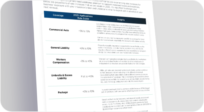 Agribusiness Rate Guide — U.S. HUB International’s rate guidance comprises an analysis of proprietary national survey data and interviews with HUB commercial insurance brokers and risk services consultants who specialize in the Agribusiness industry. On average, rates for middle- to upper-middle-market companies are experiencing rate increases for nearly all coverages as carriers need additional premium to support increased losses and expenses. Below are projections of rate increases that we anticipate in 2025. It’s important to discuss your business’ exposure with your insurance broker and understand what to expect well in advance of your next renewal. Coverage 2025 Agribusiness Insights Rate Guide Loss trends are increasing because of distracted driving and social inflation. Rate increases persist to counterbalance rising costs — labor, vehicle replacement (new), and technology-enabled Commercial Auto +5% to 15% replacement parts. Some carriers may offer more attractive terms in a multiline primary casualty program that includes workers' comp. Carriers are scrutinizing exposures specific to coverage for hired and non-owned auto, especially for accounts with claims activity. Property-casualty insurance is expected to be profitable, so the General Liability +5% to 10% overall trend in GL is stable. Carrier positions vary, and results may be different where warranted by loss experience or program design, but most clients will see modest rate increases. Workers Workers’ compensation remains highly profitable, but workplace Compensation -3% to +3% violence and classification of workers as either employees or independent contractors are possible factors for rate changes. Although rates are moderating for most clients, carriers continue to feel pressure and are reducing limits offered at renewal, Umbrella & Excess Flat to +10% necessitating that some clients seek additional carriers to secure Liability the same level of coverage. This is increasing the overall insurance spend on excess liability, especially as primary limits are also being reduced, thereby pushing more risk into the excess layers. Package +5% to 10% Insurance packages tend to be more stable because of the bigger pot of premium, with one carrier offsetting losses on any one line. Results reflect market recovery and depend heavily on account metrics (occupancy, business class, loss control, catastrophic exposure, claims history, etc.). While property premiums have stabilized, more carriers are increasing deductibles to $100,000 to $250,000 per occurrence offset losses. Commercial Property -10% to +5% Expect to see fewer carriers in the layer (i.e., more deployed capacity per layer) and more capacity lower in the tower which drives down the expense. For dairy risks, $25M is the average cap on loss limits, requiring insureds to build towers to secure adequate coverage. 8
