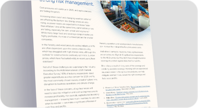 Profitability How will agribusiness deal with increasing costs and outsized risks? Strong risk management. Cost pressures will continue in 2025, and agribusinesses are feeling the pinch. 2 3 Increasing labor costs and changing weather patterns are affecting the bottom line. Energy prices are also rising, as power needs are expected to increase faster 4 And at the same time, commodities prices than inflation. are falling, especially for corn, wheat and soybeans.5 While many large food and beverage conglomerates are highly profitable, it’s more of a mixed picture for smaller companies. Forestry operations and wood products manufacturers In the forestry and wood products sector, industry profits can improve their risk profiles to cut insurance costs. are often dependent upon the construction industry, which has struggled with high interest rates, although the And when it comes to insurance, many agribusinesses outlook for construction is cautiously optimistic. Lumber are underinsured: Eight in 10 agribusiness respondents prices, which have fluctuated wildly in recent years, have to the HUB survey say they don’t have enough insurance 6 coverage to protect against risks that hurt profits. stabilized. Not all of these challenges are surprising to the industry. This is likely a result of rising costs of the coverage and According to the HUB International's 2025 Outlook shrinking available coverage. Working with an experienced 7 insurance broker in the agribusiness industry can help Executive Survey, 65% of industry respondents listed greater expenditures as a top concern for 2025 profits, mitigate premium hikes, secure the right coverage and the most commonly chosen reason, ahead of cybercrime, help boost profits. disruption to business operations and climate change. In the face of these concerns, all agribusinesses will 2. University of Illinois Farm Doc Daily, “Rising Overhead Costs Driven need to take risk mitigation and cost-saving measures to by Labor and Interest,” December 19, 2023. increase profitability. For example, sophisticated inventory 3. Green Money, “Weather’s Impact on Investing in US Agriculture: Navigating the New Normal,” May 2024. management — knowing how much inventory to keep and 4. Utility Dive, “US electricity prices rise again as AI, onshoring may when to reorder — can make a significant difference in mean decades of power demand growth: BofA,” July 8, 2024. cash flow and profits. 5. Euromonitor International, “Commodity Market Outlook Q2 2024: Pressures Have Eased But Geopolitical Flareups Drive Market Food and beverage manufacturers can take traditional Volatility,” May 30, 2024. 6. Cision, “US Housing and Lumber Prices Update – July 2024,” July measures such as futures contracts to help ensure a 19, 2024. steady supply of raw materials at a reasonable cost. 7. HUB’s Outlook Executive Survey polled 900 C-Suite and VP-level executives on the issues facing them on profitability, employee vitality and organizational resilience. 3