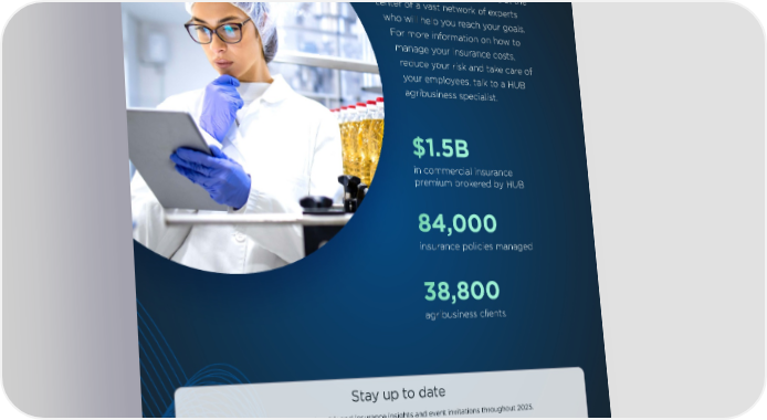HUB Agribusiness When you partner with us, you’re at the center of a vast network of experts who will help you reach your goals. For more information on how to manage your insurance costs, reduce your risk and take care of your employees, talk to a HUB agribusiness specialist. $1.5B in commercial insurance premium brokered by HUB 84,000 insurance policies managed 38,800 agribusiness clients Stay up to date Subscribe to receive risk and insurance insights and event invitations throughout 2025. Subscribe hubinternational.com