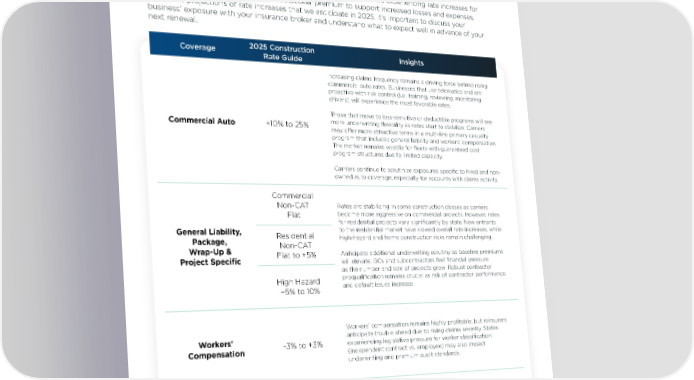 Construction Rate Guide — U.S. HUB International’s rate guidance comprises an analysis of proprietary national survey data and interviews with HUB commercial insurance brokers and risk services consultants who specialize in the construction industry. On average, rates for middle- to upper-middle-market companies are experiencing rate increases for nearly all coverages as carriers need additional premium to support increased losses and expenses. Below are projections of rate increases that we anticipate in 2025. It’s important to discuss your business’ exposure with your insurance broker and understand what to expect well in advance of your next renewal. Coverage 2025 Construction Insights Rate Guide Increasing claims frequency remains a driving force behind rising commercial auto rates. Businesses that use telematics and are proactive with risk control (i.e., training, reviewing, monitoring drivers) will experience the most favorable rates. Those that move to loss-sensitive or deductible programs will see Commercial Auto +10% to 25% more underwriting flexibility as rates start to stabilize. Carriers may offer more attractive terms in a multi-line primary casualty program that includes general liability and workers' compensation. The market remains volatile for fleets with guaranteed cost program structures due to limited capacity. Carriers continue to scrutinize exposures specific to hired and non- owned auto coverage, especially for accounts with claims activity. Commercial Non-CAT Rates are stabilizing in some construction classes as carriers Flat become more aggressive on commercial projects. However, rates for residential projects vary significantly by state. New entrants General Liability, Residential to the residential market have slowed overall rate increases, while Package, high-hazard and frame construction risks remain challenging. Wrap-Up & Non-CAT Project Specific Flat to +5% Anticipate additional underwriting scrutiny as baseline premiums will elevate. GCs and subcontractors feel financial pressure as the number and size of projects grow. Robust contractor High Hazard prequalification remains crucial as risk of contractor performance +5% to 10% and default issues increase. Workers’ compensation remains highly profitable, but reinsurers Workers' anticipate trouble ahead due to rising claims severity. States Compensation -3% to +3% experiencing legislative pressure for worker classification (independent contract vs. employee) may also impact underwriting and premium audit standards. Umbrella & Auto is the main concern for umbrella renewals and capacity Excess Liability Flat to 10% remains tight for larger, heavy-duty fleets. While the market is still hard, rates are showing signs of moderating for best-in-class risks. 8