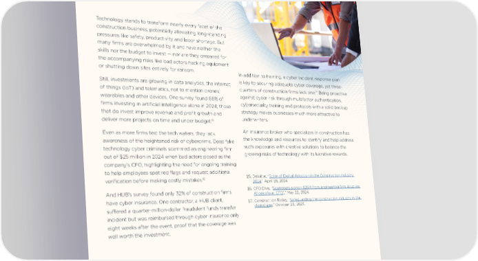 Technology Turning to tech in search of solutions. Technology stands to transform nearly every facet of the construction business, potentially alleviating long-standing pressures like safety, productivity and labor shortage. But many firms are overwhelmed by it and have neither the skills nor the budget to invest — nor are they prepared for the accompanying risks like bad actors hacking equipment or shutting down sites entirely for ransom. In addition to training, a cyber incident response plan Still, investments are growing in data analytics, the internet is key to securing adequate cyber coverage, yet three- 17 Being proactive of things (IoT) and telematics, not to mention drones, quarters of construction firms lack one. wearables and other devices. One survey found 68% of against cyber risk through multifactor authentication, firms investing in artificial intelligence alone in 2024; those cybersecurity training and protocols with a solid backup that do invest improve revenue and profit growth and strategy makes businesses much more attractive to 15 underwriters. deliver more projects on time and under budget. Even as more firms test the tech waters, they lack An insurance broker who specializes in construction has awareness of the heightened risk of cybercrime. Deep fake the knowledge and resources to identify and help address technology cyber criminals scammed an engineering firm such exposures with creative solutions to balance the out of $25 million in 2024 when bad actors posed as the growing risks of technology with its lucrative rewards. company’s CFO, highlighting the need for ongoing training to help employees spot red flags and request additional 16 15. Deloitte, “State of Digital Adoption in the Construction Industry verification before making costly mistakes. 2024,” April 18, 2024. And HUB’s survey found only 32% of construction firms 16. CFO Dive, “Scammers siphon $25M from engineering firm Arup via AI deepfake ‘CFO’,” May 22, 2024. have cyber insurance. One contractor, a HUB client, 17. Construction Today, “Safeguarding the construction industry in the suffered a quarter-million-dollar fraudulent funds transfer digital age,” October 23, 2023. incident but was reimbursed through cyber insurance only eight weeks after the event, proof that the coverage was well worth the investment. 6