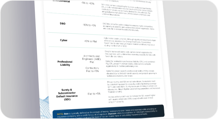 Construction Rate Guide — U.S. Coverage 2025 Construction Insights Rate Guide Rates will vary by occupancy class. Non-habitational builders may experience rate relief, while the market may see increases for any habitational exposure. Environmental -5% to +10% With new carriers competing for business, pollution legal liability (PLL) and environmental rates for most contractor classes remain stable, but markets are somewhat limited for site pollution. Per- and polyfluoroalkyl substances (PFAS) remain a hot topic and underwriting concern. D&O insurance for public companies remains highly competitive, D&O -10% to +5% as capacity is plentiful, and underwriters remain aggressive. Terms and conditions remain favorable for insureds. Cyber rates continue to fall. Although significant breaches/outages Cyber -10% to Flat with service providers (i.e. Change Healthcare, Crowdstrike) haven’t led to rate hikes yet, harder market conditions may occur during the first half of 2025. Despite increased claims cost, carriers remain aggressive for new business, with underwriters reserving capacity for risks with Architects and favorable loss history. Engineers (A&E): Professional Flat Rates for contractors professional liability (CPL) and combined Liability PLL/CPL programs remain stable, while carriers compete Contractors: aggressively for better-performing risks. Flat to +5% Rates for project-specific professional liability (PSPL) remain elevated due to limited market capacity and projects growing in technical complexity and scope. Though surety and SDI are not rate-driven, the markets react by constraining appetite, capacity, and/or tightening coverage Surety & terms and conditions. Surety losses are climbing in certain sub- classes, resulting in tighter underwriting parameters and increased Subcontractor Flat to +5% financial scrutiny. Default Insurance (SDI) As loss activity continues to increase for SDI, expect higher self-insured retentions (SIRs) coupled with more limited program capacity. . NOTE: Rate is typically defined as the amount of money necessary to cover losses and expenses while providing an insurance company with a profit for a unit of exposure. Exposure refers to a business’ or individual’s susceptibility to various daily risks. Carriers evaluate the level of risk an insured faces in calculating insurance premiums. 10