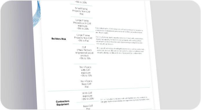 Construction Rate Guide — U.S. Coverage 2025 Construction Insights Rate Guide Small Frame Projects with CAT exposure +5% to 20% Small Frame Projects Non-CAT Flat Large Frame Projects with CAT exposure How catastrophic (CAT) areas are defined continues to broaden to +5% to 20% underwrite the increased prevalence of wildfire, convective storm and flood events. Large Frame For any frame project, capacity remains limited, with underwriters Builders Risk Projects Non-CAT reserving capacity for best-in-class projects with well-qualified -5% to Flat developers and contractors and above-average compliance and site security protocols. CLT The use of technology to mitigate jobsite risks, such as water leak (Mass Timber) detection devices, fire protection systems, video surveillance and engineered wood security alarms, continues to be a focal point for underwriters. product +5% to 15% Non-Frame with CAT exposure +5% to 15% Non-Frame Non-CAT Flat With CAT exposure Contractors +5% to 20% Similar to builders risk, insureds with tighter security controls to Equipment mitigate theft-related claims are experiencing more favorable rates. Non-CAT Flat With CAT exposure Installation +5% to 20% Rates have stabilized for non-CAT-exposed sites. Expect some Floater rate relief for CAT exposure. Non-CAT Flat 9