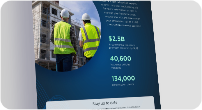 HUB Construction When you partner with us, you’re at the center of a vast network of experts who will help you reach your goals. For more information on how to manage your insurance costs, reduce your risk and take care of your employees, talk to a HUB construction insurance specialist. $2.5B in commercial insurance premium brokered by HUB 40,600 insurance policies managed 134,000 construction clients Stay up to date Subscribe to receive risk and insurance insights and event invitations throughout 2025. Subscribe hubinternational.com