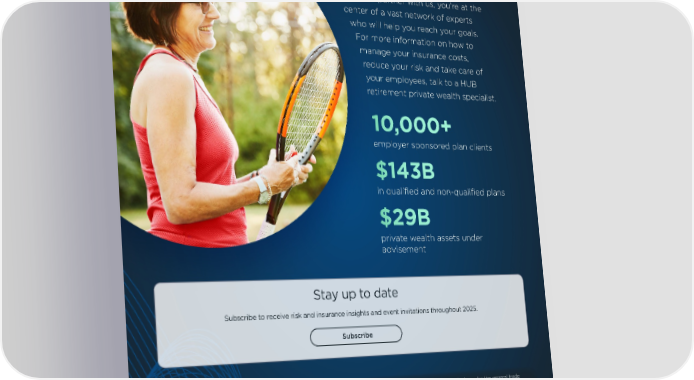 HUB Retirement & Private Wealth When you partner with us, you’re at the center of a vast network of experts who will help you reach your goals. For more information on how to manage your insurance costs, reduce your risk and take care of your employees, talk to a HUB retirement private wealth specialist. 10,000+ employer sponsored plan clients $143B in qualified and non-qualified plans $29B private wealth assets under advisement Stay up to date Subscribe to receive risk and insurance insights and event invitations throughout 2025. Subscribe HUB International Limited (“HUB”) owned RIAs provide investment advisory and management services to its respective clients, under the general trade name of HUB Retirement and Private Wealth. All current HUB RIAs maintain a combined total of $172,292,249,664 in aggregated regulatory assets under management (“Aggregated AUM”), based on the reported AUM for each respective individual HUB RIA effective as of December 31, 2023. The AUM for each individual HUB RIA may be found in the respective Form ADV for each respective HUB RIA. This Aggregated AUM for all HUB RIAs are broken out as follows: $109,326,671,524 in nondiscretionary institutional AUM; which AUM primarily represents qualified retirement plan assets (both ERISA and non-ERISA plans), non-qualified plan assets, and other types of institutional assets. $33,455,679,298 in discretionary institutional AUM; which AUM primarily represents qualified retirement plan assets (both ERISA and non-ERISA plans), non-qualified plan assets, and other types of institutional assets. $29,509,868,842 in Private Wealth Client AUM; which is a combination of both discretionary and non-discretionary AUM. hubinternational.com