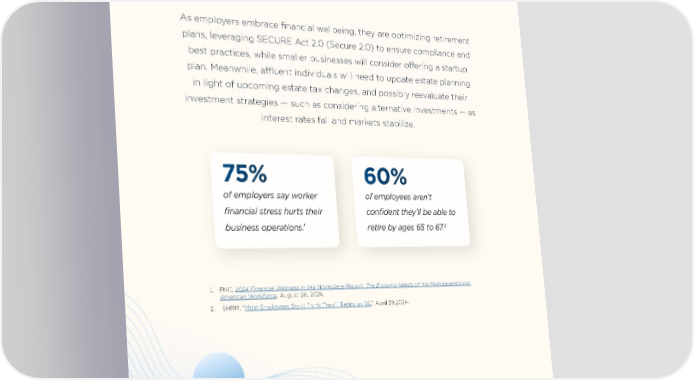 What to Expect in 2025 What to Expect in 2025 As employers embrace financial wellbeing, they are optimizing retirement plans, leveraging SECURE Act 2.0 (Secure 2.0) to ensure compliance and best practices, while smaller businesses will consider offering a startup plan. Meanwhile, afÒuent individuals will need to update estate planning in light of upcoming estate tax changes, and possibly reevaluate their investment strategies — such as considering alternative investments — as interest rates fall and markets stabilize. 75% 60% of employers say worker of employees aren’t financial stress hurts their confident they’ll be able to 1 2 business operations. retire by ages 65 to 67. 1. PNC, 2024 Financial Wellness in the Workplace Report: The Evolving Needs of the Multigenerational American Workforce, August 28, 2024. 2. SHRM, “Most Employees Don’t Think They’ll Retire by 65,” April 29,2024.