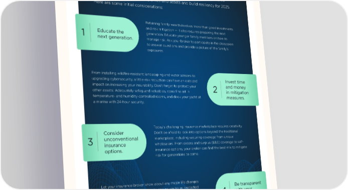 Navigating Your Next Steps HUB Private Client Risk Advisors will work with you to develop a tailored strategy to protect your properties and assets and build resiliency for 2025. Here are some initial considerations: Retaining family wealth involves more than good investments and risk mitigation — it also requires preparing the next 1 Educate the generation. Educate younger family members on how to next generation. manage risk. Ask your broker to participate in the discussion to answer questions and provide a picture of the family’s exposures. From installing wildfire-resistant landscaping and water sensors to upgrading cybersecurity, a little risk reduction can have an outsized Invest time impact on increasing your insurability. Don’t forget to protect your 2 and money other assets: Adequately safeguard valuables, store fine art in in mitigation temperature- and humidity-controlled rooms, and dock your yacht at measures. a marina with 24-hour security. Today’s challenging insurance marketplace requires creativity. Consider Don’t be afraid to look into options beyond the traditional 3 unconventional marketplace, including securing coverage from unique insurance wholesalers. From excess and surplus (E&S) coverage to self- options. insurance options, your broker can find the best mix to mitigate risk for generations to come. Let your insurance broker know about any major life changes or planned property purchases to ensure you’re as protected Be transparent as possible. Review exposures and insurance needs at least 90 4 with your days prior to your policy renewal to allow your broker to find broker. the optimal mix of coverage for your family’s needs. 7 7