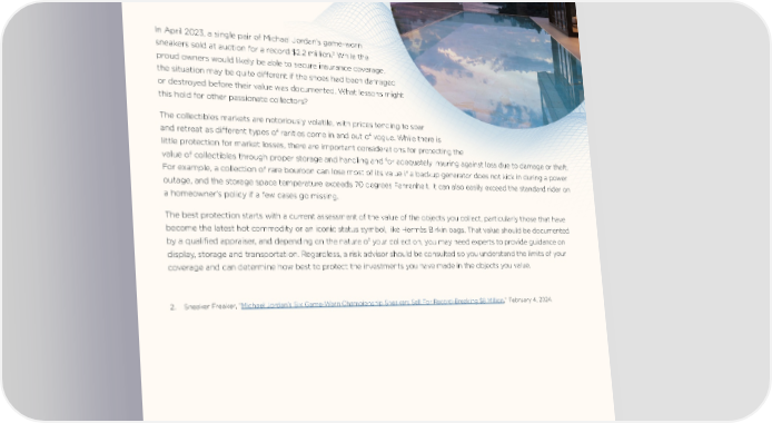Covering Collectibles Protecting the rising value of valuables. In April 2023, a single pair of Michael Jordan’s game-worn 2 While the sneakers sold at auction for a record $2.2 million. proud owners would likely be able to secure insurance coverage, the situation may be quite different if the shoes had been damaged or destroyed before their value was documented. What lessons might this hold for other passionate collectors? The collectibles markets are notoriously volatile, with prices tending to soar and retreat as different types of rarities come in and out of vogue. While there is little protection for market losses, there are important considerations for protecting the value of collectibles through proper storage and handling and for adequately insuring against loss due to damage or theft. For example, a collection of rare bourbon can lose most of its value if a backup generator does not kick in during a power outage, and the storage space temperature exceeds 70 degrees Fahrenheit. It can also easily exceed the standard rider on a homeowner’s policy if a few cases go missing. The best protection starts with a current assessment of the value of the objects you collect, particularly those that have become the latest hot commodity or an iconic status symbol, like Hermès Birkin bags. That value should be documented by a qualified appraiser, and depending on the nature of your collection, you may need experts to provide guidance on display, storage and transportation. Regardless, a risk advisor should be consulted so you understand the limits of your coverage and can determine how best to protect the investments you have made in the objects you value. 2. Sneaker Freaker, “Michael Jordan’s Six Game-Worn Championship Sneakers Sell For Record-Breaking $8 Million,” February 4, 2024. 4
