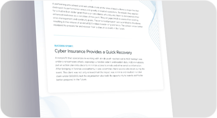SUCCESS STORY: Rising from the Ashes A performing arts school (and not a HUB client at the time of loss) suffered a major fire that destroyed its performance venue and greatly disrupted operations. To rebuild, they applied for a multimillion-dollar grant from a private donor, who required them to demonstrate their enhanced resilience as a condition of the grant. They engaged HUB to assess their existing crisis management and continuity plans. The enhanced program was submitted to the donor, resulting in the release of an initial $2.5 million transfer of grant funds. The school is now better equipped to prepare for and recover from a disruptive event in the future. SUCCESS STORY: Cyber Insurance Provides a Quick Recovery A nonprofit that specializes in working with at-risk youth reached out to HUB fearing it was under a ransomware attack, exposing vulnerable patient and resident data. HUB immediately put an action plan into place to minimize access to emails and other sensitive information. After bringing in forensic accountants, it was determined there was no data stolen during the event. The client was not only relieved that the impact was minimal and resulted in a total claim under $60,000, but the organization also took the opportunity to train its staff to be better prepared in the future. 11 | HUB International 2025 North American Outlook Report