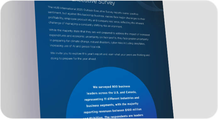 The HUB International 2025 Outlook Executive Survey The HUB International 2025 Outlook Executive Survey reports overall positive sentiment, but against this backdrop business leaders face major challenges to their profitability, employee productivity and company resilience, reflecting the inherent challenge of managing a constantly shifting risk environment. While the majority state that they are well prepared to address the impact of increased expenditures and economic uncertainty on their profits, they face greater uncertainty in preparing for climate change, natural disasters, cyber risks including deepfakes, increasing use of AI and geopolitical risk. We invite you to explore this year’s report and learn what your peers are thinking and doing to prepare for the year ahead. We surveyed 900 business leaders across the U.S. and Canada, representing 11 different industries and business segments, with the majority reporting revenues between $100 million and $1 billion. The respondents are leaders and decision-makers in corporate leadership, risk management and human resources at both public and private companies and nonprofit organizations.