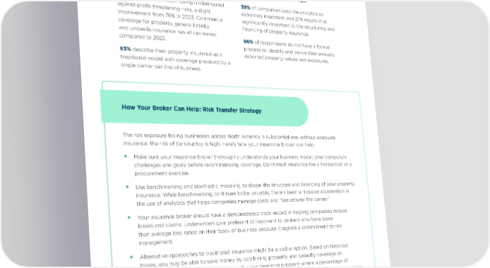 Rely on Insurance to Protect the Bottom Line The cost and availability of insurance is under pressure across many industries and geographies. According to the HUB survey, economic challenges and inflation have significantly to moderately affected 81% of companies' ability to secure ample insurance coverage. 73% of companies report being underinsured 39% of companies describe analytics as against profit-threatening risks, a slight extremely important and 27% regard it as improvement from 76% in 2023. Commercial significantly important to the structuring and coverage for property, general liability financing of property insurance. and umbrella insurance has all decreased compared to 2023. 96% of respondents do not have a formal process to identify and derive their annually 63% describe their property insurance as a reported property values and exposures. traditional model with coverage provided by a single carrier per line of business. How Your Broker Can Help: Risk Transfer Strategy The risk exposure facing businesses across North America is substantial and without adequate insurance, the risk of bankruptcy is high. Here’s how your insurance broker can help. • Make sure your insurance broker thoroughly understands your business model, your company’s challenges and goals before recommending coverage. Don’t treat insurance like a transaction or a procurement exercise. • Use benchmarking and stochastic modeling to shape the structure and financing of your property insurance. While benchmarking continues to be valuable, there’s been a massive acceleration in the use of analytics that helps companies manage costs and “see around the corner.” • Your insurance broker should have a demonstrated track record in helping companies reduce losses and claims. Underwriters give preferential treatment to brokers who have lower than average loss ratios on their book of business because it signals a commitment to risk management. • Alternative approaches to traditional insurance might be a viable option. Based on historical losses, you may be able to save money by combining property and casualty coverage on an excess policy. Or you may secure a multi-year insurance program where a percentage of premiums are returned if losses are better than anticipated. Another option is insurance programs that require a letter of credit. • Identify the assets and the emerging risks that cannot be covered and lean into enterprise risk management to mitigate it. HUB International 2025 North American Outlook Report | 14