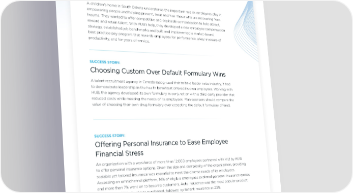 SUCCESS STORY: Designing Compensation Plans That Boost Performance A children's home in South Dakota understands the important role its employees play in empowering people and helping prevent, treat and heal those who are recovering from trauma. They wanted to offer competitive and equitable compensation to help attract, reward and retain talent. With HUB’s help, they developed a new employee compensation strategy, established job benchmarks and built and implemented a market-based, best practice pay program that rewards employees for performance, a key measure of productivity, and for years of service. SUCCESS STORY: Choosing Custom Over Default Formulary Wins A talent recruitment agency in Canada recognized that to be a leader in its industry, it had to demonstrate leadership in the health benefits it offered its own employees. Working with HUB, the agency developed its own formulary in conjunction with a third-party provider that reduced costs while meeting the needs of its employees. Plan sponsors should compare the value of choosing their own drug formulary over accepting the default formulary offered. SUCCESS STORY: Offering Personal Insurance to Ease Employee Financial Stress An organization with a workforce of more than 12,000 employees partnered with VIU by HUB to offer personal insurance options. Given the size and complexity of the organization, providing scalable yet tailored insurance was essential to meet the diverse needs of its employees. Accessing an omnichannel platform, 14% of eligible employees explored personal insurance quotes and more than 7% went on to become customers. Auto insurance was the most popular product, representing 50% of policies purchased, followed by tenant insurance at 23%. This collaboration demonstrates the value of VIU by HUB’s digital-first approach to insurance, making it easier for employees to find coverage that fits their individual needs and enhancing the organization’s overall benefits offering. HUB International 2025 North American Outlook Report | 18