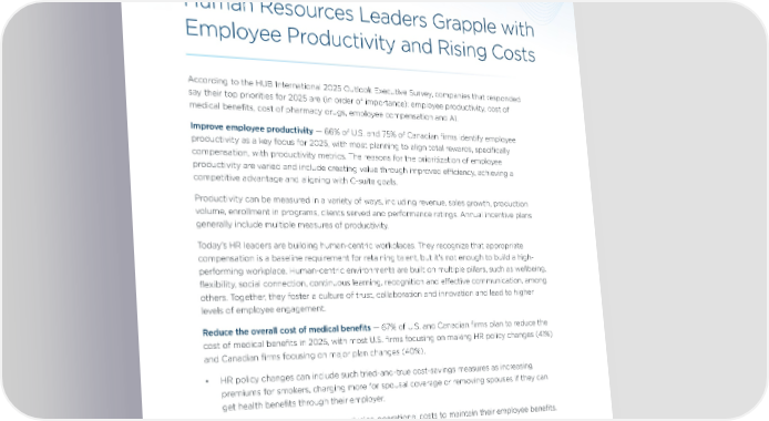 Workforce Vitality Human Resources Leaders Grapple with Employee Productivity and Rising Costs According to the HUB International 2025 Outlook Executive Survey, companies that responded say their top priorities for 2025 are (in order of importance): employee productivity, cost of medical benefits, cost of pharmacy drugs, employee compensation and AI. Improve employee productivity — 66% of U.S. and 75% of Canadian firms identify employee productivity as a key focus for 2025, with most planning to align total rewards, specifically compensation, with productivity metrics. The reasons for the prioritization of employee productivity are varied and include creating value through improved efÏciency, achieving a competitive advantage and aligning with C-suite goals. Productivity can be measured in a variety of ways, including revenue, sales growth, production volume, enrollment in programs, clients served and performance ratings. Annual incentive plans generally include multiple measures of productivity. Today’s HR leaders are building human-centric workplaces. They recognize that appropriate compensation is a baseline requirement for retaining talent, but it’s not enough to build a high- performing workplace. Human-centric environments are built on multiple pillars, such as wellbeing, flexibility, social connection, continuous learning, recognition and effective communication, among others. Together, they foster a culture of trust, collaboration and innovation and lead to higher levels of employee engagement. Reduce the overall cost of medical benefits — 67% of U.S. and Canadian firms plan to reduce the cost of medical benefits in 2025, with most U.S. firms focusing on making HR policy changes (41%) and Canadian firms focusing on major plan changes (40%). • HR policy changes can include such tried-and-true cost-savings measures as increasing premiums for smokers, charging more for spousal coverage or removing spouses if they can get health benefits through their employer. • 61% of survey respondents are reducing operational costs to maintain their employee benefits. Employers can also reduce costs through managing health and employee wellbeing. Studies have shown that the ROI for wellness programs is about $1.50 to $3 less in medical claims for every dollar spent. hubinternational.com 15 | HUB International 2025 North American Outlook Report