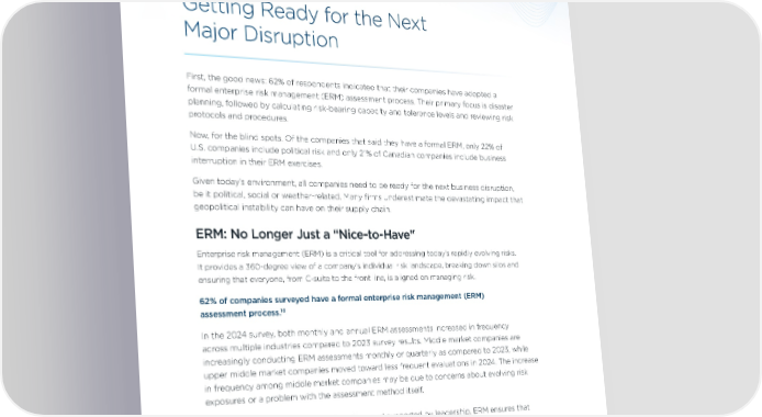 Resiliency Getting Ready for the Next Major Disruption First, the good news: 62% of respondents indicated that their companies have adopted a formal enterprise risk management (ERM) assessment process. Their primary focus is disaster planning, followed by calculating risk-bearing capacity and tolerance levels and reviewing risk protocols and procedures. Now, for the blind spots. Of the companies that said they have a formal ERM, only 22% of U.S. companies include political risk and only 21% of Canadian companies include business interruption in their ERM exercises. Given today’s environment, all companies need to be ready for the next business disruption, be it political, social or weather-related. Many firms underestimate the devastating impact that geopolitical instability can have on their supply chain. ERM: No Longer Just a “Nice-to-Have" Enterprise risk management (ERM) is a critical tool for addressing today’s rapidly evolving risks. It provides a 360-degree view of a company’s individual risk landscape, breaking down silos and ensuring that everyone, from C-suite to the front line, is aligned on managing risk. 62% of companies surveyed have a formal enterprise risk management (ERM) 10 assessment process. In the 2024 survey, both monthly and annual ERM assessments increased in frequency across multiple industries compared to 2023 survey results. Middle market companies are increasingly conducting ERM assessments monthly or quarterly as compared to 2023, while upper middle market companies moved toward less frequent evaluations in 2024. The increase in frequency among middle market companies may be due to concerns about evolving risk exposures or a problem with the assessment method itself. When embedded into a company’s culture and supported by leadership, ERM ensures that risks are managed before they escalate. 10. HUB International 2025 Outlook Executive Survey 22 | HUB International 2025 North American Outlook Report