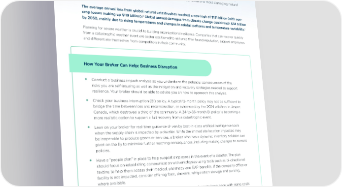 Managing the Universal Threat of Climate Change The frequency and intensity of extreme weather impacts communities that just a few years ago were largely unaffected. Record-breaking floods, heatwaves, wildfires and storms are all becoming more recurrent and more intense. Severe convective storms are among the most common and most damaging natural catastrophes worldwide. The average annual loss from global natural catastrophes reached a new high of $151 billion (with non- 2 crop losses making up $119 billion). Global annual damages from climate change could reach $38 trillion 3 by 2050, mainly due to rising temperatures and changes in rainfall patterns and temperature variability. Planning for severe weather is crucial to building organizational resilience. Companies that can recover quickly from a catastrophic weather event are better positioned to enhance their brand reputation, support employees and differentiate themselves from competitors in their community. Here’s how your insurance broker can help you prepare for a major How Your Broker Can Help: Business Disruption business disruption: • Conduct a business impact analysis so you understand the potential consequences of the risks you are self-insuring as well as the mitigation and recovery strategies needed to support resilience. Your broker should be able to advise you on how to approach this analysis. • Check your business interruption (BI) policy. A typical 12-month policy may not be sufÏcient to bridge the time between loss and reconstruction, as evidenced by the 2024 wildfires in Jasper, Canada, which destroyed a third of the community. A 24-to-36-month BI policy is becoming a more realistic option to support a full recovery from a catastrophic event. • Lean on your broker for real-time guidance driven by best-in-class artificial intelligence tools when the supply chain is impacted by a disaster. While the immediate location impacted may be inoperable to produce goods or services, a broker who has a dynamic inventory solution can pivot on the fly to minimize further reaching consequences, including making changes to current policies. • Have a “people plan” in place to help support employees in the event of a disaster. The plan should focus on establishing communication with employees using tools such as bi-directional texting to help them access their medical, pharmacy and EAP benefits. If the company ofÏce or facility is not impacted, consider offering food, showers, refrigeration storage and parking, where available. • Annually update replacement costs in property insurance policies to keep pace with rising costs and property values and develop a multi-year plan to keep up with building maintenance. 2. Verisk, “New Report: Average Annual Natural Catastrophe Losses for the Insurance Industry Reaches New High of $151 Billion,” September 3, 2024 3. Forbes, “Climate Damage To Hit $38trn - The Economy Needs Action Now,” April 22, 2024 9 | HUB Int9 | HUB Internaernational 2025 North American Outlook Rtional 2025 North American Outlook Reporteport