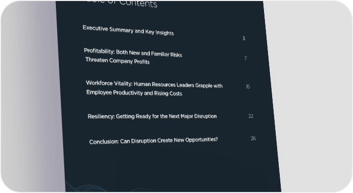 Table of Contents Executive Summary and Key Insights 3 Profitability: Both New and Familiar Risks 7 Threaten Company Profits Workforce Vitality: Human Resources Leaders Grapple with 15 Employee Productivity and Rising Costs Resiliency: Getting Ready for the Next Major Disruption 22 Conclusion: Can Disruption Create New Opportunities? 26