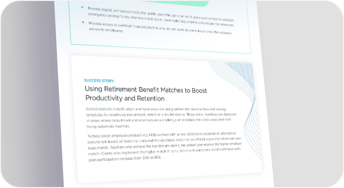 How Your Advisor Can Help: Financial Wellness How Your Advisor Can Help: Financial Wellness • Provide digital, self-service tools that guide users through a series of goals such as how to establish emergency savings funds, improve credit score, lower debt, buy a home and prepare for retirement. • Provide access to certified financial coaches who do not work on commission and offer unbiased advice to employees. SUCCESS STORY: Using Retirement Benefit Matches to Boost Productivity and Retention School districts in both urban and rural areas are using retirement plan matches and vesting schedules to incentivize recruitment, retention and attendance. These extra incentives are deployed in areas where recruitment and retention are a challenge or to reduce the costs associated with hiring substitute teachers. To help boost employee productivity, HUB worked with school districts to establish an attendance benchmark based on historical data and the additional match to be offered above the retirement plan base match. Teachers who achieve the benchmark during the school year receive the higher employer match. Clients who implement the higher match in conjunction with automatic enrollment have seen plan participation increase from 35% to 95%. 19 | HUB International 2025 North American Outlook Report