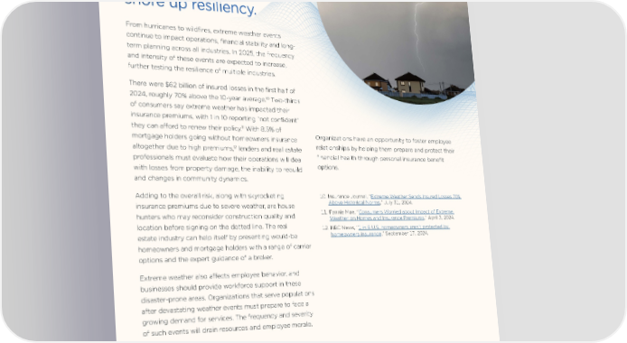 Trend Watch Organizations with benefit options will weather the storm and shore up resiliency. From hurricanes to wildfires, extreme weather events continue to impact operations, financial stability and long- term planning across all industries. In 2025, the frequency and intensity of these events are expected to increase, further testing the resilience of multiple industries. There were $62 billion of insured losses in the first half of 10 2024, roughly 70% above the 10-year average. Two-thirds of consumers say extreme weather has impacted their insurance premiums, with 1 in 10 reporting “not confident” 11 With 8.5% of they can afford to renew their policy. mortgage holders going without homeowners insurance Organizations have an opportunity to foster employee 12 relationships by helping them prepare and protect their altogether due to high premiums, lenders and real estate professionals must evaluate how their operations will deal financial health through personal insurance benefit with losses from property damage, the inability to rebuild options. and changes in community dynamics. Adding to the overall risk, along with skyrocketing 10. Insurance Journal, “Extreme Weather Sends Insured Losses 70% insurance premiums due to severe weather, are house Above Historical Norms,” July 31, 2024. hunters who may reconsider construction quality and 11. Fannie Mae, “Consumers Worried about Impact of Extreme Weather on Homes and Insurance Premiums,” April 3, 2024. location before signing on the dotted line. The real 12. NBC News, “1 in 8 U.S. homeowners aren’t protected by estate industry can help itself by presenting would-be homeowners insurance,” September 17, 2024. homeowners and mortgage holders with a range of carrier options and the expert guidance of a broker. Extreme weather also affects employee behavior, and businesses should provide workforce support in these disaster-prone areas. Organizations that serve populations after devastating weather events must prepare to face a growing demand for services. The frequency and severity of such events will drain resources and employee morale. 6
