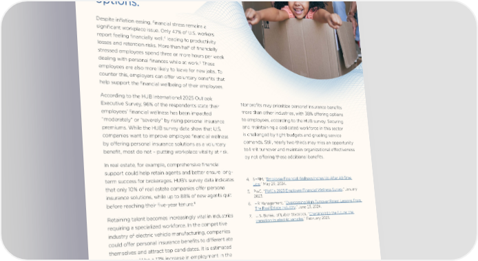 Vitality Enhance employee financial wellness with personal insurance options. Despite inflation easing, financial stress remains a significant workplace issue. Only 47% of U.S. workers report feeling financially well,4 leading to productivity losses and retention risks. More than half of financially stressed employees spend three or more hours per week 5 These dealing with personal finances while at work. employees are also more likely to leave for new jobs. To counter this, employers can offer voluntary benefits that help support the financial wellbeing of their employees. According to the HUB International 2025 Outlook Executive Survey, 96% of the respondents state their Nonprofits may prioritize personal insurance benefits employees’ financial wellness has been impacted more than other industries, with 38% offering options “moderately” or “severely” by rising personal insurance to employees, according to the HUB survey. Securing premiums. While the HUB survey data show that U.S. and maintaining a dedicated workforce in this sector companies want to improve employee financial wellness is challenged by tight budgets and grueling service by offering personal insurance solutions as a voluntary demands. Still, nearly two-thirds may miss an opportunity benefit, most do not – putting workplace vitality at risk. to limit turnover and maintain organizational effectiveness by not offering these additional benefits. In real estate, for example, comprehensive financial support could help retain agents and better ensure long- term success for brokerages. HUB’s survey data indicates 4. SHRM, “Employee Financial Wellness Inches Up After All-Time that only 10% of real estate companies offer personal Low,” May 29, 2024. insurance solutions, while up to 88% of new agents quit 5. PwC, “PWC’s 2023 Employee Financial Wellness Survey,” January 2023. 6 before reaching their five-year tenure. 6. HR Management, “Overcoming High Turnover Rates: Lessons From The Real Estate Industry,” June 13, 2024. Retaining talent becomes increasingly vital in industries 7. U.S. Bureau of Labor Statistics, “Charging into the future: the requiring a specialized workforce. In the competitive transition to electric vehicles,” February 2023. industry of electric vehicle manufacturing, companies could offer personal insurance benefits to differentiate themselves and attract top candidates. It is estimated that there will be a 17% increase in employment in the sector between 2021 to 2031, so businesses must prioritize 7 benefits to retain skilled workers amid growing demand. 4