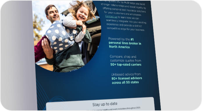 Personal Insurance Marketplace Partnering with VIU by HUB helps you build stronger relationships and boost loyalty by offering personalized insurance solutions for your customers and employees. Contact us to learn how we can seamlessly integrate into your existing experience and provide a distinct competitive edge for your business. Powered by the #1 personal lines broker in North America Compare, shop and customize quotes from 50+ top-rated carriers Unbiased advice from 80+ licensed advisors across all 50 states Stay up to date Subscribe to receive risk and insurance insights and event invitations throughout 2025. Subscribe viubyhub.com