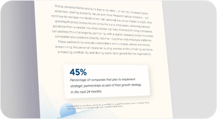 What to Expect in 2025 Rising personal home and auto insurance rates – driven by increased claims expenses, soaring property values and more frequent natural disasters – will continue to reshape the North American personal insurance market in 2025. With growing financial pressures on consumers and employees, obtaining tailored guidance from a neutral insurance broker can help. Forward-thinking companies can address this challenge by partnering with a digital insurance broker to embed comprehensive solutions directly into their customer and employee platforms. These partnerships provide stakeholders with unbiased advice and choice, streamlining the personal insurance buying process while cultivating resilience, enhancing profitability and driving sustainable growth for the organization. 45% Percentage of companies that plan to implement strategic partnerships as part of their growth strategy in the next 24 months. Source: HUB’s Outlook Executive Survey polled 900 C-Suite and VP-level executives on the issues facing them on profitability, employee vitality and organizational resilience. 2