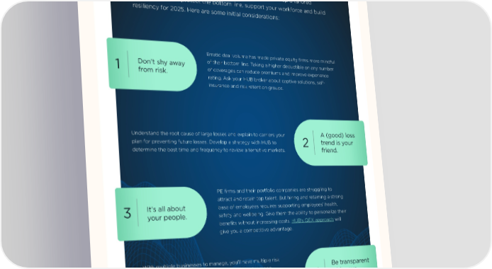 Navigating Your Next Steps Navigating Your Next Steps HUB construction insurance, risk management and employee benefits HUB private equity specialists will work with you to develop a tailored specialists will work with you to develop a tailored strategy that will protect strategy that will protect the bottom line, support your workforce and build the bottom line, support your workforce and build resiliency for 2025. Here resiliency for 2025. Here are some initial considerations: are some initial considerations: Making risk management a pillar of your organization’s culture Erratic deal volume has made private equity firms more mindful Develop a can help identify exposures and develop response plans in case of their bottom line. Taking a higher deductible on any number Don't shy away of any type of incident, whether that is a weather-related event, 1 comprehensive of coverages can reduce premiums and improve experience 1 from risk. a threat of physical safety or a cyberattack. Make sure your risk plan. rating. Ask your HUB broker about captive solutions, self- broker understands how to approach risk and can identify gaps insurance and risk retention groups. in insurance that could disrupt your daily operations. To compete for a shrinking pool of skilled labor, personalized benefits Create a based on HUB Workforce Persona Analysis and data analytics can A (good) loss Understand the root cause of large losses and explain to carriers your personalized help your company differentiate itself from the competition. Creating 2 plan for preventing future losses. Develop a strategy with HUB to trend is your a quality employee experience (QEX) will boost engagement, improve 2 benefits determine the best time and frequency to review alternative markets. friend. recruitment and retention and promote worker wellbeing strategy. PE firms and their portfolio companies are struggling to Remain Safety is already the focal point of your operation, but with attract and retain top talent. But hiring and retaining a strong focused on an influx of new and less-experienced workers, injury risks 3 It's all about base of employees requires supporting employees’ health, 3 workplace increase. Work with a risk professional to review your safety your people. safety and wellbeing. Give them the ability to personalize their safety. program at least annually and address any issues. benefits without increasing costs. HUB’s QEX approach will give you a competitive advantage. Stay in contact with your broker and let them know about With multiple businesses to manage, you’ll have multiple risk Be transparent changes to the business to eliminate surprises at renewal. Be transparent issues. Let your broker know what changes you’ve made with your Review exposures and insurance needs at least 90 days prior 4 with your so there are no surprises at renewal. Review exposures and 4 broker. to policy renewal to allow your broker to find the optimal broker. insurance needs at least 90 days prior to policy renewal, so your coverages for your organization. broker can identify the best options. 7 7