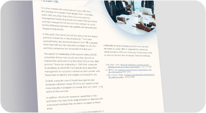 Leadership Management at portcos will remain essential to sustain returns. In a slow market with extended exit cycles, PE firms are holding on to assets much longer than in previous years. Not only does that affect insurance and risk management needs at portcos but means that leadership and top management to run portfolio companies could be the difference between top-quartile performance and disappointing results. In this spirit, the race to recruit top executives to manage 11 That’s also portfolio companies is only increasing. exemplified by the increased concern from PE managers: More than half say that executive retention risk for their nationwide are implementing auto/home and personal 12 insurance solutions (48% of respondents), enhancing portfolio companies has increased in the last year. retirement plans (43%) and improving compensation (41%) The search for leadership at the approximately 23,000 as ways to improve their employees’ financial wellbeing. companies that private equity owns has become so intense that some are hiring first-time CEOs to lead their 13 11. Business Insider, “Move over dealmakers, portfolio-company portcos. Some are embracing a “CEO-first” approach to investing, in which PE firms recruit rising stars from operators are the rising stars of private equity,” August 14, 2024. management at successful companies, then partner with 12. Alix Partners, Leadership and the Future of Value Creation: The New PE Imperative, March 2024. those hires to identify and acquire a company to lead. 13. Hunt Scanlon Media, “The Rise of First-Time CEOs in Private Equity Portfolio Companies,” June 21, 2024. Overall, a broader view of talent development and employee retention means PE firms will need to invest more robustly in programs to recruit, train and retain rising talent at their portcos. In addition, the human resources capabilities of their portfolios may need to be supplemented or replaced with outsourced solutions that are better equipped in these areas. PE management can also look to improved compensation and inventive benefits strategies to keep lower-level employees engaged at their portfolio companies. For instance, according to the HUB survey, companies 66