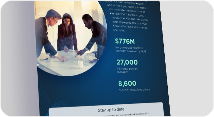 HUB Financial Institutions When you partner with us, you’re at the center of a vast network of experts who will help you reach your goals. For more information on how to manage your insurance costs, reduce your risk and take care of your employees, talk to a HUB financial institutions insurance specialist. $776M in commercial insurance premium brokered by HUB 27,000 insurance policies managed 8,600 financial institutions clients Stay up to date Subscribe to receive risk and insurance insights and event invitations throughout 2025. Subscribe hubinternational.com