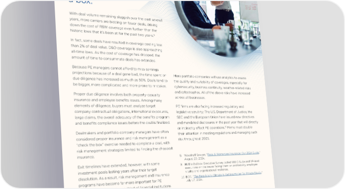 Resiliency Insurance and risk management will no longer mean checking a box. With deal volume remaining sluggish over the past several years, more carriers are bidding on fewer deals, driving down the cost of R&W coverage even further than the historic lows that it’s been at for the past two years.8 In fact, some deals have resulted in coverage costing less than 2% of deal value. D&O coverage is also approaching all-time lows. As the cost of coverage has dropped, the amount of time to consummate deals has extended. Because PE managers cannot afford to miss earnings projections because of a deal gone bad, the time spent on More portfolio companies will use analytics to assess due diligence has increased as much as 50%. Deals tend to the quality and suitability of coverages, especially for be bigger, more complicated and more prone to mistakes. cybersecurity, business continuity, weather-related risks and catastrophes. All of the above risks have increased Proper due diligence involves both property-casualty across all businesses. insurance and employee benefits issues. Among many elements of diligence, buyers must analyze target PE firms are also facing increased regulatory and company contractual obligations, international exposures, legislative scrutiny: The U.S. Department of Justice, the large claims, the overall adequacy of the benefits program SEC and the European Union have issued new directives and benefits compliance issues before the deal is finalized. and mandated disclosures in the past year that will directly 10 Firms must double or indirectly affect PE operations. Dealmakers and portfolio company managers have often their attention in meeting regulations and managing such considered proper insurance and risk management as a risk throughout 2025. “check the box” exercise needed to complete a deal, with risk management strategies limited to finding the cheapest insurance. 8. Woodruff Sawyer, “Reps & Warranties Insurance: Our 2024 Guide,” August 20, 2024. Exit timelines have extended, however, with some 9. HUB’s Outlook Executive Survey polled 900 C-Suite and VP-level investment pools lasting years after their target executives on the issues facing them on profitability, employee dissolution. As a result, risk management and insurance vitality and organizational resilience. programs have become far more important for PE 10. BCG, “The Regulatory Climate Is Getting Hotter for Private Equity,” July 17, 2024. firms’ portcos. Yet fully one-third of financial institutions responding to HUB International's Outlook Executive 9 Survey reported they do not have a formal enterprise risk management assessment process. This could lead to suboptimal risk management, inadequate insurance and — ultimately — inferior results. 55