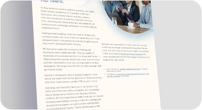 Vitality PE firms of all sizes will have opportunities to recruit and retain top talent. As they battle for talent to lead their portfolio companies, there’s always competition for top talent at PE firms themselves. And whether they’re recruiting analysts 6 from elite universities or poaching directors from rival firms, attracting and retaining the best and brightest will continue to be a challenge, particularly for smaller and less established funds. Adding to that challenge, more than half of PE firms lack succession plans, and most of the rest report they don’t have adequate talent in the pipeline to promote, largely because they haven’t developed talent internally. But there are opportunities for them: Such firms can get similar results through a strong benefits partner that can PE executives realize the importance of hiring and deliver the same type of services as a highly compensated developing talent within their firm. They say quality of CHRO. Tools such as Workforce Persona Analysis help leadership and succession are the most important factors in deliver personalized benefits that engage employees at all determining their success, three times more important than levels of the organization. portfolio rationalization and twice as important as artificial 7 No longer can a PE firm hire a B-level team and intelligence. get A-level results. 6. Peak Frameworks, “Best Private Equity Placement,” accessed September 12, 2024. Instead of sitting back, they’re seeing an opportunity to 7. Alix Partners, Leadership and the Future of Value Creation: The recruit top talent from the full spectrum of financial services, New PE Imperative, March 2024. often from organizations outside of PE or even finance. And large, well-heeled PE firms are hiring former CFOs, CMOs and CTOs from other companies, and increasingly, they’re hiring former Chief Human Resource OfÏcers (CHROs). PE firms hope that ex-CHROs not only can elevate recruiting and retention, but also implement learning and development programs, as well as create sophisticated, personalized benefits plans. They’re also leveraging that expertise within their portfolio companies. Smaller PE shops usually cannot afford to hire high- level CHROs from top companies, as such positions can command mid-six-figure salaries plus bonuses. 4