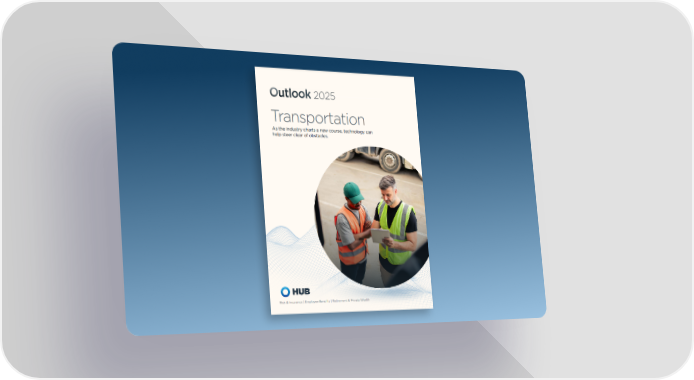 HUB Transportation When you partner with us, you’re at the center of a vast network of experts who will help you reach your goals. For more information on how to manage your insurance costs, reduce your risk and take care of your employees, talk to a HUB transportation insurance specialist. $1.84B in commercial insurance premium brokered by HUB 57,000 insurance policies managed 24,000 transportation clients Stay up to date Subscribe to receive risk and insurance insights and event invitations throughout 2025. Subscribe hubinternational.com