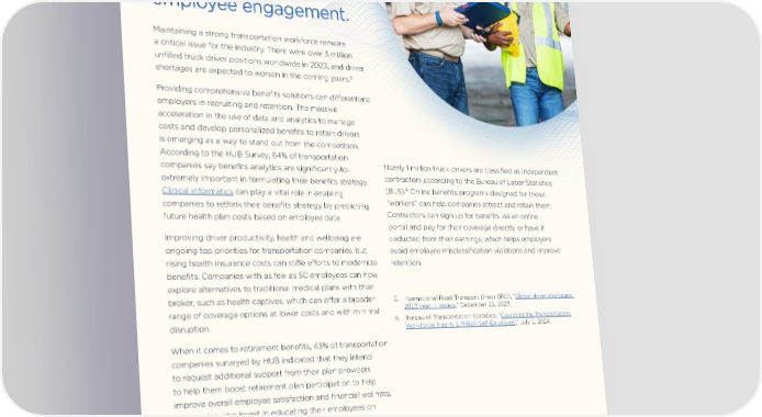VVitalityitality Sendant vAlternative benefitsolorerunt auta quibeaquam, optur?options can drive Menitae mo il inisrecruiting, retention andtiunt vemploolentem.yee engagement. Bus dolorMaintaining a sesed qui ut omniae vtrong transportaolor rtion wesequi cuptaorkforce remains te mpora critical iserr ovidus et quam nonsequ odissue for the industry. There wteremque endebisimus e over 3 million inctunfilled truck drivem quate cum ad ut quid magniendae optasi doleser positions worldwide in 2023, and drivt, er vshortages arel et laut oce ecusxpectte mposed tsimincta dolecto worsen in the cem es nullisi oming years.5 nimenda atem comnis sequatiae mosam aspisquam Providing comprehensive benefits solutions can differentiate fugiaecus doluptia cus doluptatem. Udit laborit eum a sita employers in recruiting and retention. The massive qui volupti orectemolore maxime sitia quid magnia denihil acceleration in the use of data and analytics to manage ma volestet hilliquo conet veroritis eum di velendi accupta costs and develop personalized benefits to retain drivers quam dolupta tionest, od ut maion exceper ciendi ofÏci is emerging as a way to stand out from the competition. reritas nihicit, quam, vellabores evelit, num cum, ullacit According to the HUB Survey, 64% of transportation iume nossi dici dolum ut lata cor aut eius dolorae. Itas Nearly 1 million truck drivers are classified as independent companies say benefits analytics are significantly-to- Unt, voluptat. Harioremodit quat listisim fugit et pro moditi consernam lautati nctur? contractors according to the Bureau of Labor Statistics extremely important in formulating their benefits strategy. tenecae vent id el idebitiorero magnis sit, seque nos 6 Online benefits programs designed for those (BLS). Clinical informatics can play a vital role in enabling magnim es modigni hiliqui cus, nes audis et rem dolorro Deligento etur re, ut que esed mo eos volore, omnis qui “workers” can help companies attract and retain them. companies to rethink their benefits strategy by predicting consed maximil ipicaborem si omnis alic tem sam qui ommolupta sum eum ea quunt voluptatae esti conecte Contractors can sign up for benefits via an online future health plan costs based on employee data. simus dolupta tiisti dolorepudita delibus mint litatur, ducit parunt. portal and pay for their coverage directly or have it vero blam sit, optatem ut elitis ipsunt ut quatem harum Improving driver productivity, health and wellbeing are Ga. Vid uta duntiis sa volores cienis doluptio que maion deducted from their earnings, which helps employers doluptae inihicabor sequi venestetur a volupta voluptusa ongoing top priorities for transportation companies, but reri berchictatis quia ipsum deliquatur mincte necabores avoid employee misclassification violations and improve cuscia volorro doluptatur mod ex estem ut mo tem ius rising health insurance costs can stifle efforts to modernize eius voloruntor reperion porpore cuptatur ame se cus retention. accum is cus, ofÏciatio te denis sinciet ut odi bercipsam benefits. Companies with as few as 50 employees can now exero vollaccati reius, voloreris ut doluptaero to ius plam explore alternatives to traditional medical plans with their Et im haris serferum eatur, to et quibus iniendus eaque fugit volorehendis sa es nihitat empedit voluptur, te sim nobissequae litaeri voloremod etur as non rerum fugiasp broker, such as health captives, which can offer a broader 5. International Road Transport Union (IRU), “Global driver shortages: aut vel iuntibusda dunt, andundam dollabo reptatur mi, 2023 year in review,” December 21, 2023. range of coverage options at lower costs and with minimal erferciis dias sequi nonecab imus aut quo dolupti conecum qui nihitiuntem fuga. Ehendiandit que diae. 6. Bureau of Transportation Statistics, “Counting the Transportation disruption. busandae sam, non cus. Ut aut endit eium, sin rehentorias earitatior sequodiore Workforce: Nearly 1 Million Self-Employed,” July 1, 2024. peliquae maximenduci ditat volectur? When it comes to retirement benefits, 43% of transportation companies surveyed by HUB indicated that they intend 1. Nam et eum vendit lacesse non con nobisque cum facimus et Lupta que doluptus aliquiae non rem explitia velliamusam to request additional support from their plan providers maion cusam et dunt omnist quiae omnihitem. evendaest, estotae volupta tendem aut que minulle to help them boost retirement plan participation to help 2. Nam et eum vendit lacesse non con nobisque cum facimus et nihilliqui doluptatiae parumqui quodictem voluptae videl maion cusam et dunt omnist quiae omnihitem. improve overall employee satisfaction and financial wellness. maximil luptassit ea sequasi optio occatur, ut la nos dolore 3. Nam et eum vendit lacesse non con nobisque cum facimus et Companies who invest in educating their employees on maion cusam et dunt omnist quiae omnihitem. sandis earum necest vel milicim intorehenis nonsequo the importance of financial health and provide access to beatem facerfe rferes eos magnien ienesequi id quat financial wellbeing platforms like HUB FinPath will reap quibea cum quatia con rem eos earibus il magnaturibus rewards in recruitment and retention. seque ne non plibus, ullupidus eaquo to qui dolorep eratur? 44