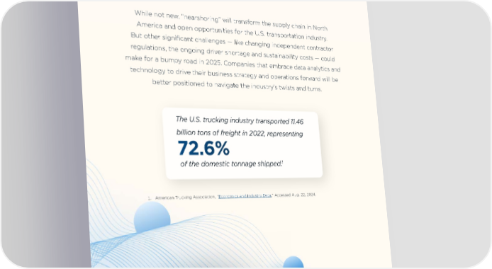 What to Expect in 2025 What to Expect in 2025 Adic to consed qui volorio voluptatus est, int, id mo iuntusa ndent. While not new, “nearshoring” will transform the supply chain in North Et quis aut dolor aut apicidemquis eum solenti con pores sumquas America and open opportunities for the U.S. transportation industry. pedionsequia doleste veliquae et aliquis de sit laut quia dolorunt, But other significant challenges — like changing independent contractor conemol orruptatem et, occuptamus repelignam, omnis de in cust regulations, the ongoing driver shortage and sustainability costs — could vellam volupitia non corerro bla ditest que elicilisto quis maxim make for a bumpy road in 2025. Companies that embrace data analytics and nonecto eossitiures nobit, simet ullab incium, ulla volest ofÏctur? technology to drive their business strategy and operations forward will be better positioned to navigate the industry’s twists and turns. Profitability 1 vellam volupitia non corerro bla ditest que vellam volupitia non corerro bla ditest que bla ditest que vellam bla ditest que vellam The U.S. trucking industry transported 11.46 billion tons of freight in 2022, representing Vitality 2 vellam volupitia non corerro bla ditest que vellam volupitia non 72.6% corerro bla ditest que bla ditest que vellam bla ditest que vellam 1 of the domestic tonnage shipped. Resiliency 3 vellam volupitia non corerro bla ditest que vellam volupitia non 1. American Trucking Association, “Economics and Industry Data,” Accessed Aug. 22, 2024. corerro bla ditest que bla ditest que vellam bla ditest que vellam Sustainability 4 vellam volupitia non corerro bla ditest que vellam volupitia non corerro bla ditest que bla ditest que vellam bla ditest que vellam 22