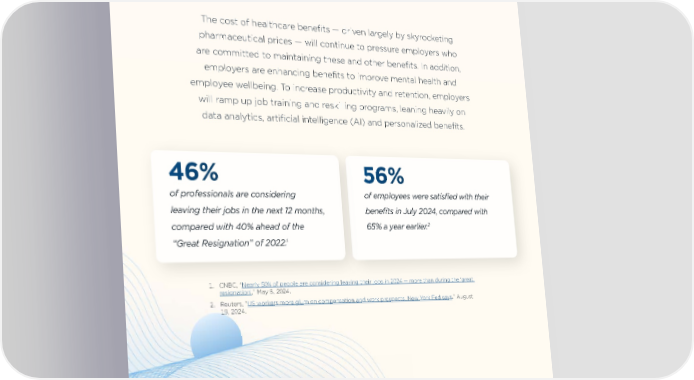 What to Expect in 2025 What to Expect in 2025 Adic to consed qui volorio voluptatus est, int, id mo iuntusa ndent. The cost of healthcare benefits — driven largely by skyrocketing Et quis aut dolor aut apicidemquis eum solenti con pores sumquas pharmaceutical prices — will continue to pressure employers who pedionsequia doleste veliquae et aliquis de sit laut quia dolorunt, are committed to maintaining these and other benefits. In addition, conemol orruptatem et, occuptamus repelignam, omnis de in cust employers are enhancing benefits to improve mental health and vellam volupitia non corerro bla ditest que elicilisto quis maxim employee wellbeing. To increase productivity and retention, employers nonecto eossitiures nobit, simet ullab incium, ulla volest ofÏctur? will ramp up job training and reskilling programs, leaning heavily on data analytics, artificial intelligence (AI) and personalized benefits. Profitability 1 vellam volupitia non corerro bla ditest que vellam volupitia non corerro bla ditest que bla ditest que vellam bla ditest que vellam 46% 56% of professionals are considering of employees were satisfied with their Vitality vellam volupitia non corerro bla ditest que vellam volupitia non leaving their jobs in the next 12 months, benefits in July 2024, compared with 2 corerro bla ditest que bla ditest que vellam bla ditest que vellam 2 compared with 40% ahead of the 65% a year earlier. 1 “Great Resignation” of 2022. Resiliency 3 vellam volupitia non corerro bla ditest que vellam volupitia non corerro bla ditest que bla ditest que vellam bla ditest que vellam 1. CNBC, “Nearly 50% of people are considering leaving their jobs in 2024 — more than during the ‘great resignation’,” May 8, 2024. 2. Reuters, “US workers more glum on compensation and work prospects, New York Fed says,” August 19, 2024. Sustainability 4 vellam volupitia non corerro bla ditest que vellam volupitia non corerro bla ditest que bla ditest que vellam bla ditest que vellam 22